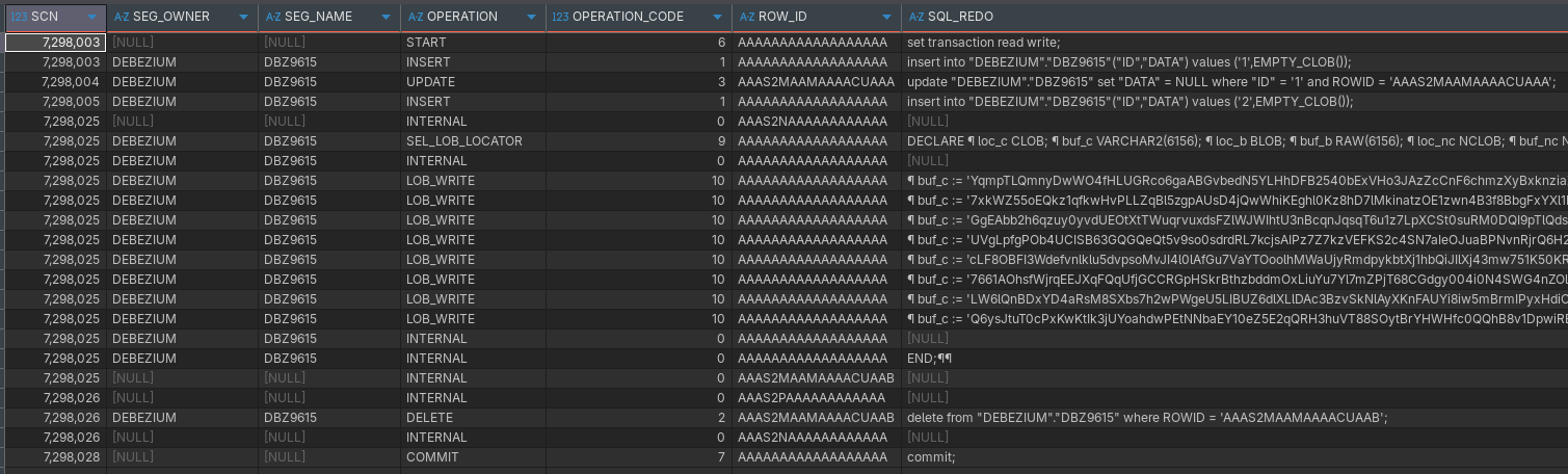 When we see the INSERT and UPDATE for ID=11, those will be merged, but the LOB consolidation process only focuses on the column values, not the event metadata, so the UPDATE is folded into the INSERT, and the INSERT is left with a ROW_ID of all As.