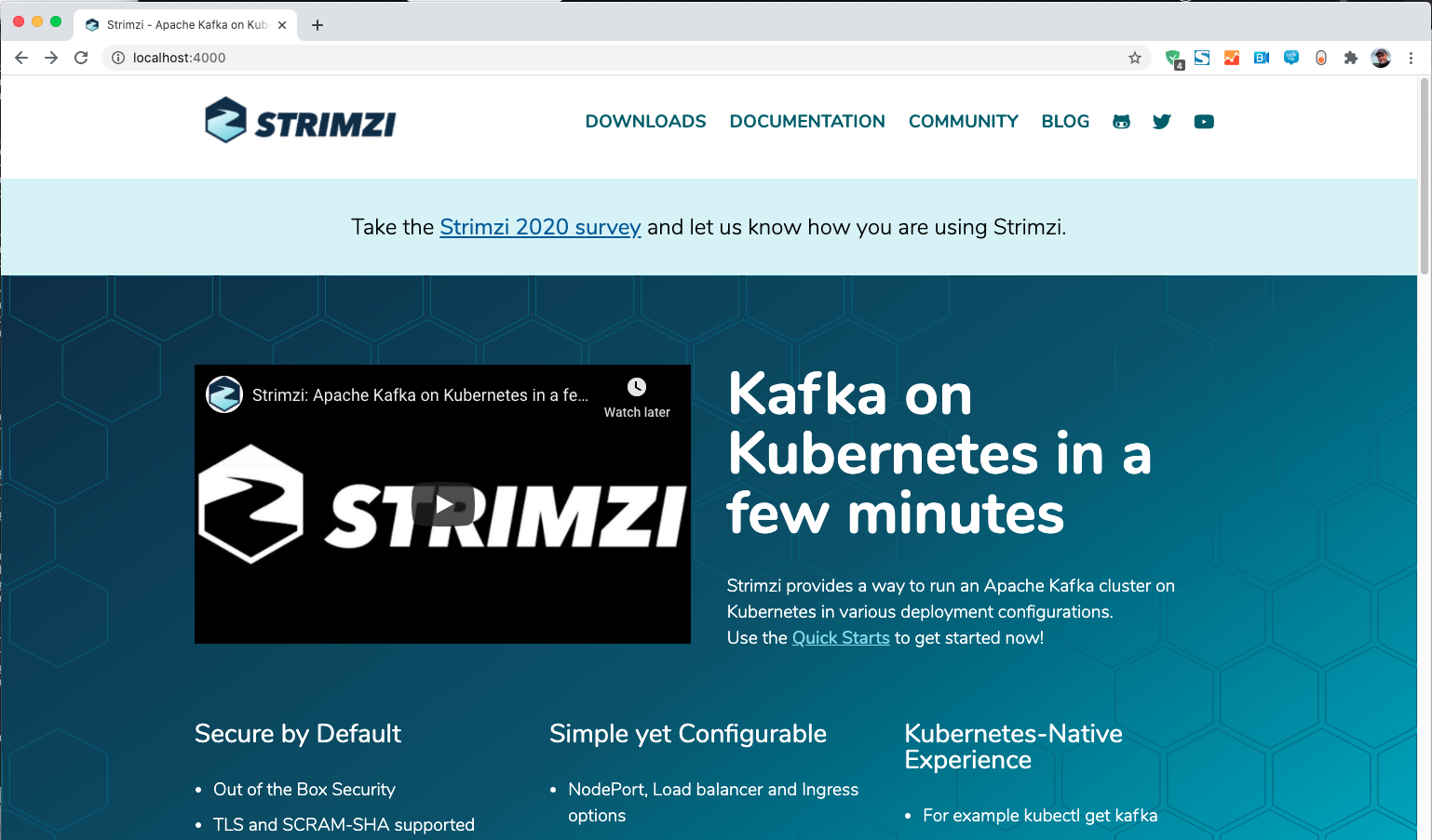 1) Create Announcement/Alert banner for the top of the site for short term promotion. Use it to promote the "Strimzi Survey 2020"