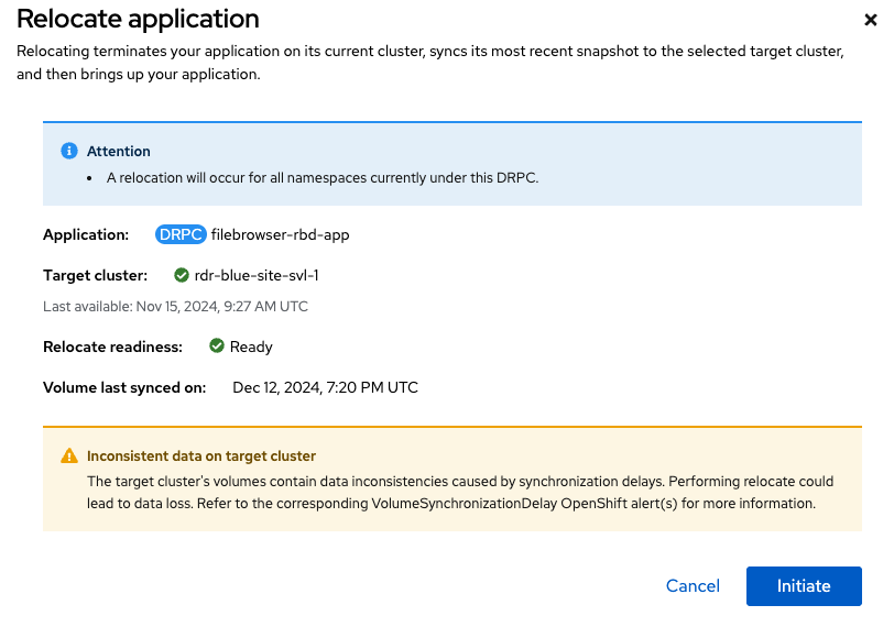 DFBUGS-866 [RDR] When incorrect target cluster is selected for failover/relocate operations, the existing warning alert "Inconsistent data on target cluster" doesn't go away
