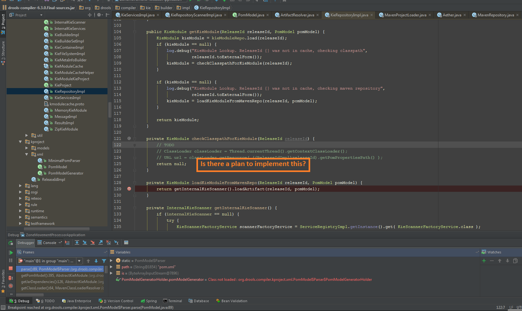 private KieModule checkClasspathForKieModule(ReleaseId releaseId) { // TODO // ClassLoader classLoader = Thread.currentThread().getContextClassLoader(); // URL url = classLoader.getResource( ((ReleaseIdImpl)releaseId).getPomPropertiesPath() ); return null; }