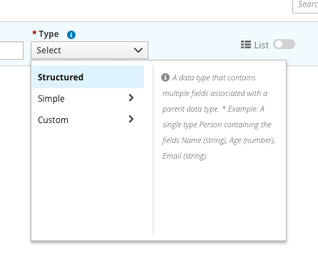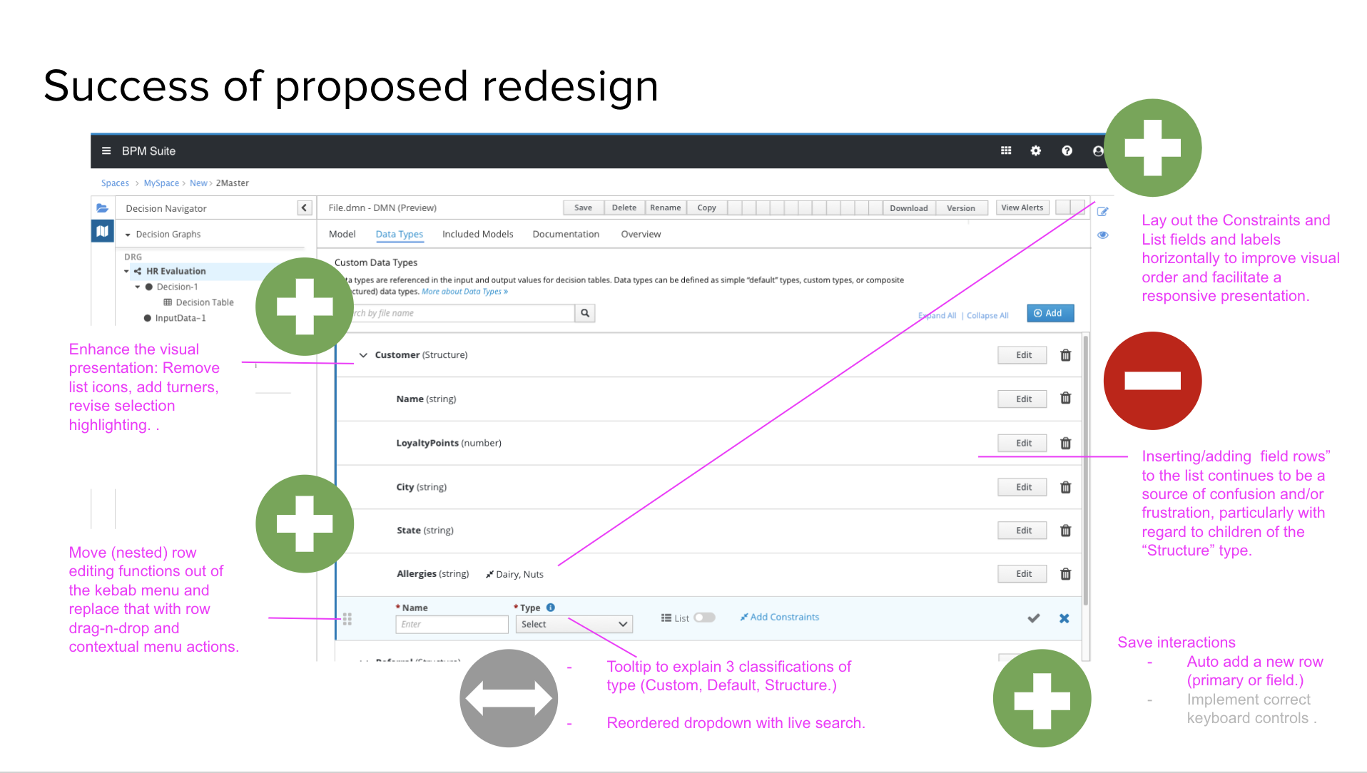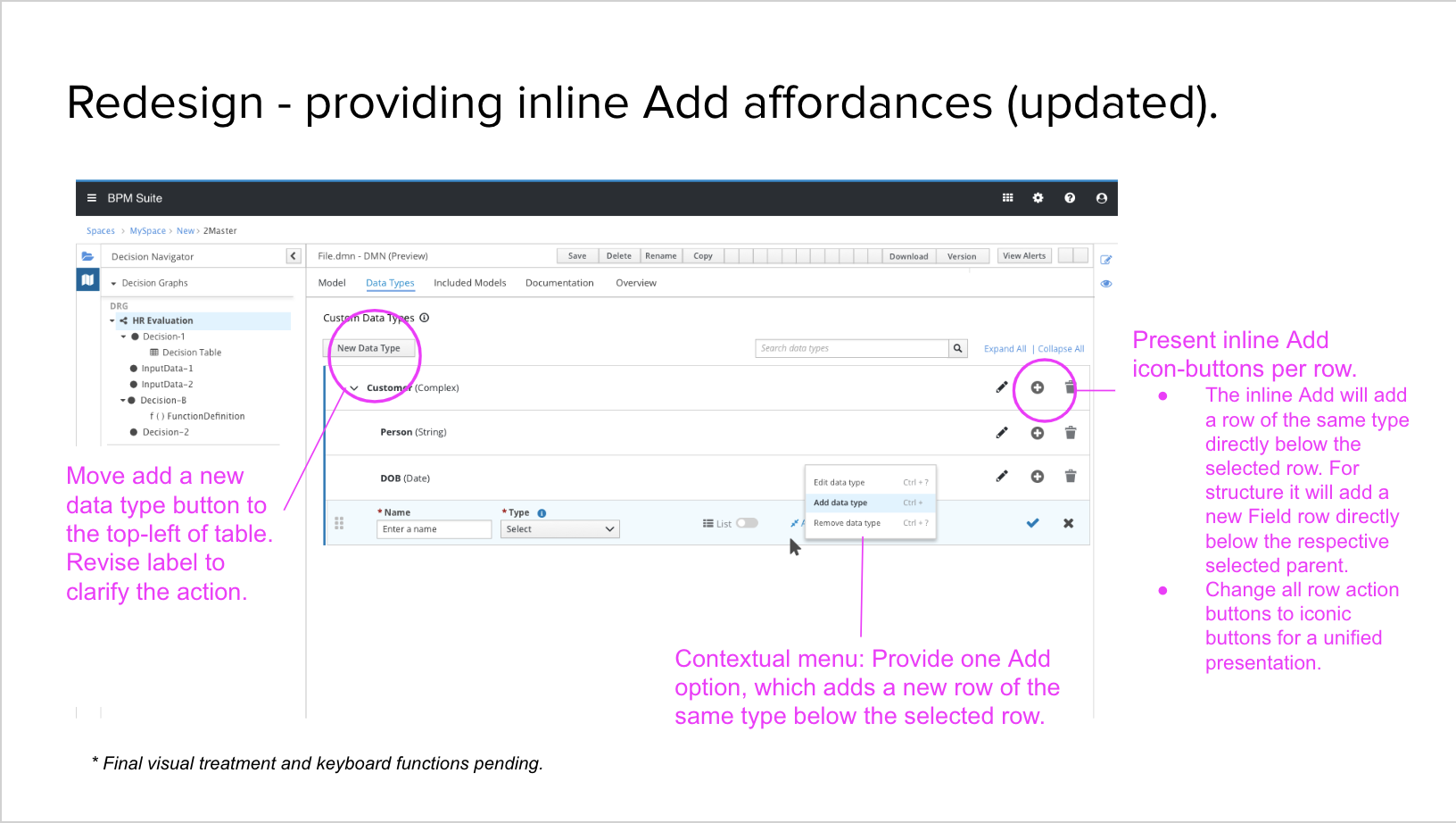 Create an updated wireframe click-thru to document the redesign of the Data Type editor based on usability study findings, as documented at: https://docs.google.com/presentation/d/10GZUd6oLaQohK27iJ1S6eF-WfvF8whXH5eu4nr4TVoI/edit