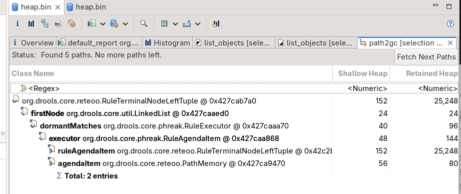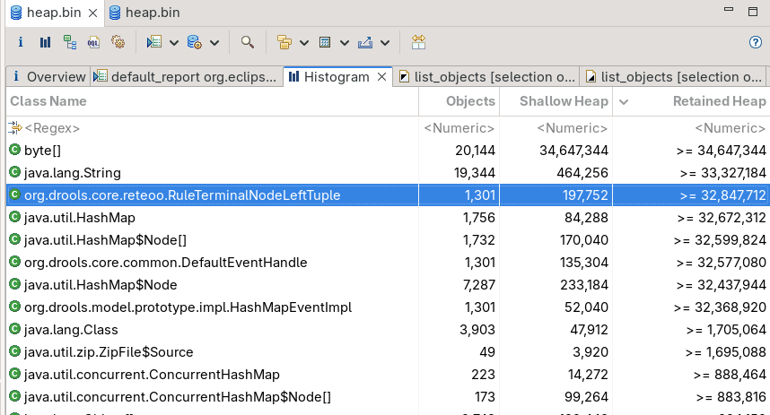 RuleTerminalNodeLeftTuple objects are retained by RuleExecutor.dormantMatches, which was introduced by https://github.com/apache/incubator-kie-drools/pull/5821
