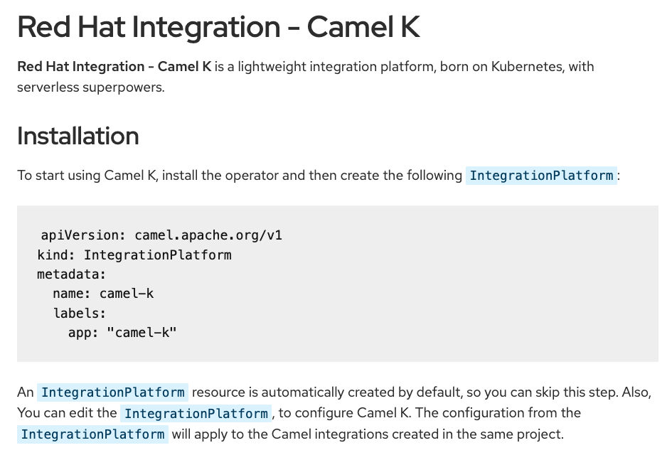 It is not clear, that an IntegrationPlatform gets installed lazily on first use by an Integration if none has been created manually (but sounds more like that it is immediately created when the operator is installed).