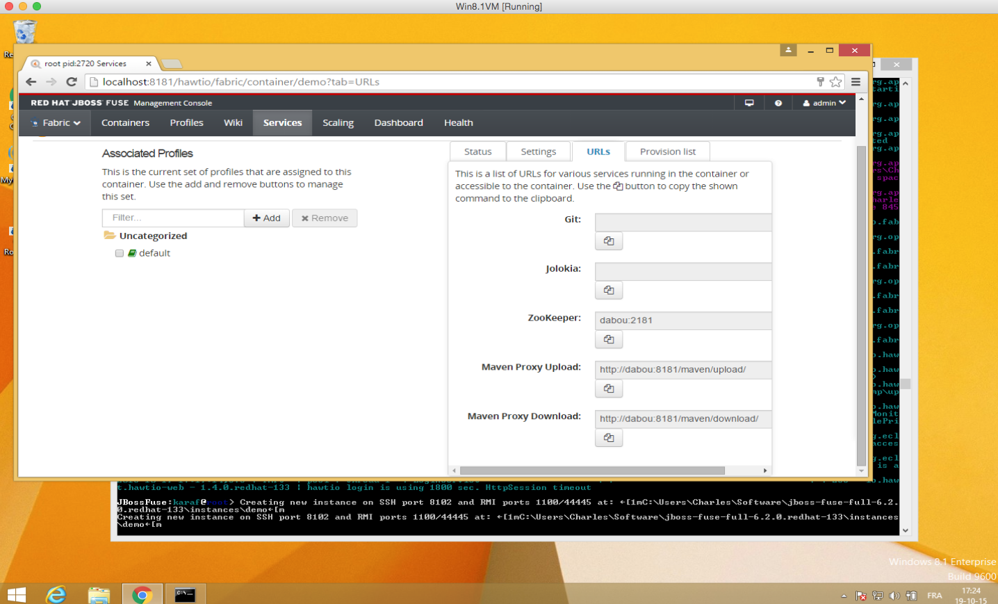 We can also observe from the screenshots that the jolokia/git addresses aren't defined, that the child container is created using the hostname of the machine even if we pass as bind address 127.0.0.1