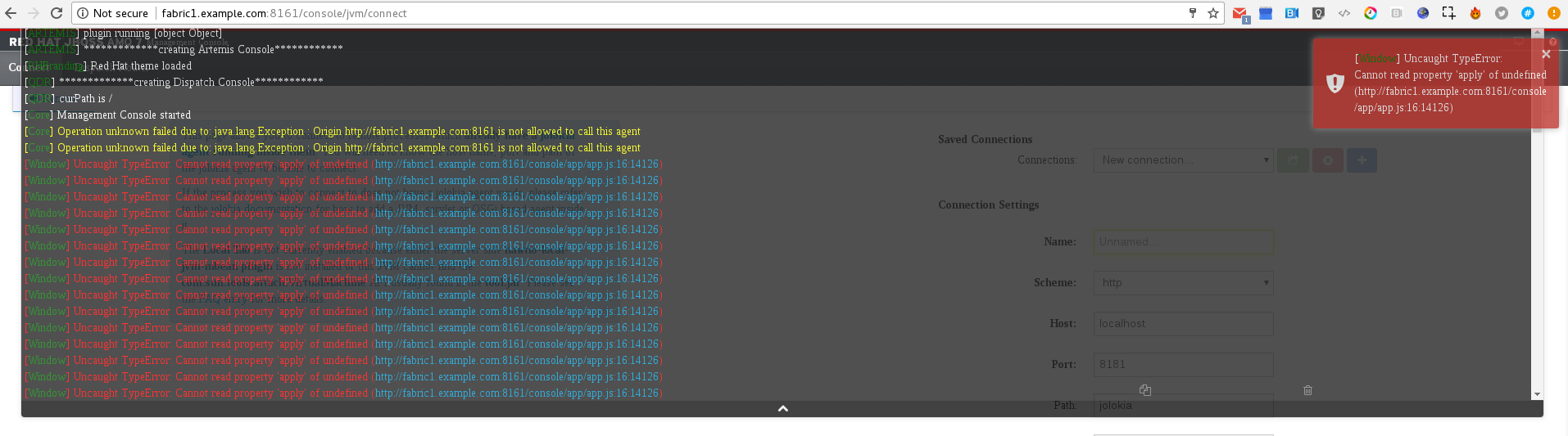 [ARTEMIS] plugin running [object Object] [ARTEMIS] *************creating Artemis Console************ [RHBranding] Red Hat theme loaded [QDR] *************creating Dispatch Console************ [QDR] curPath is / [Core] Management Console started [Core] Operation unknown failed due to: java.lang.Exception : Origin http://fabric1.example.com:8161 is not allowed to call this agent [Core] Operation unknown failed due to: java.lang.Exception : Origin http://fabric1.example.com:8161 is not allowed to call this agent [Window] Uncaught TypeError: Cannot read property 'apply' of undefined