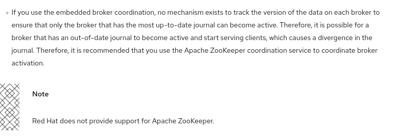 The documentation recommends the use of Apache ZooKeeper coordination service to coordinate broker activation. Recommending a non red Hat supported component seems misleading.