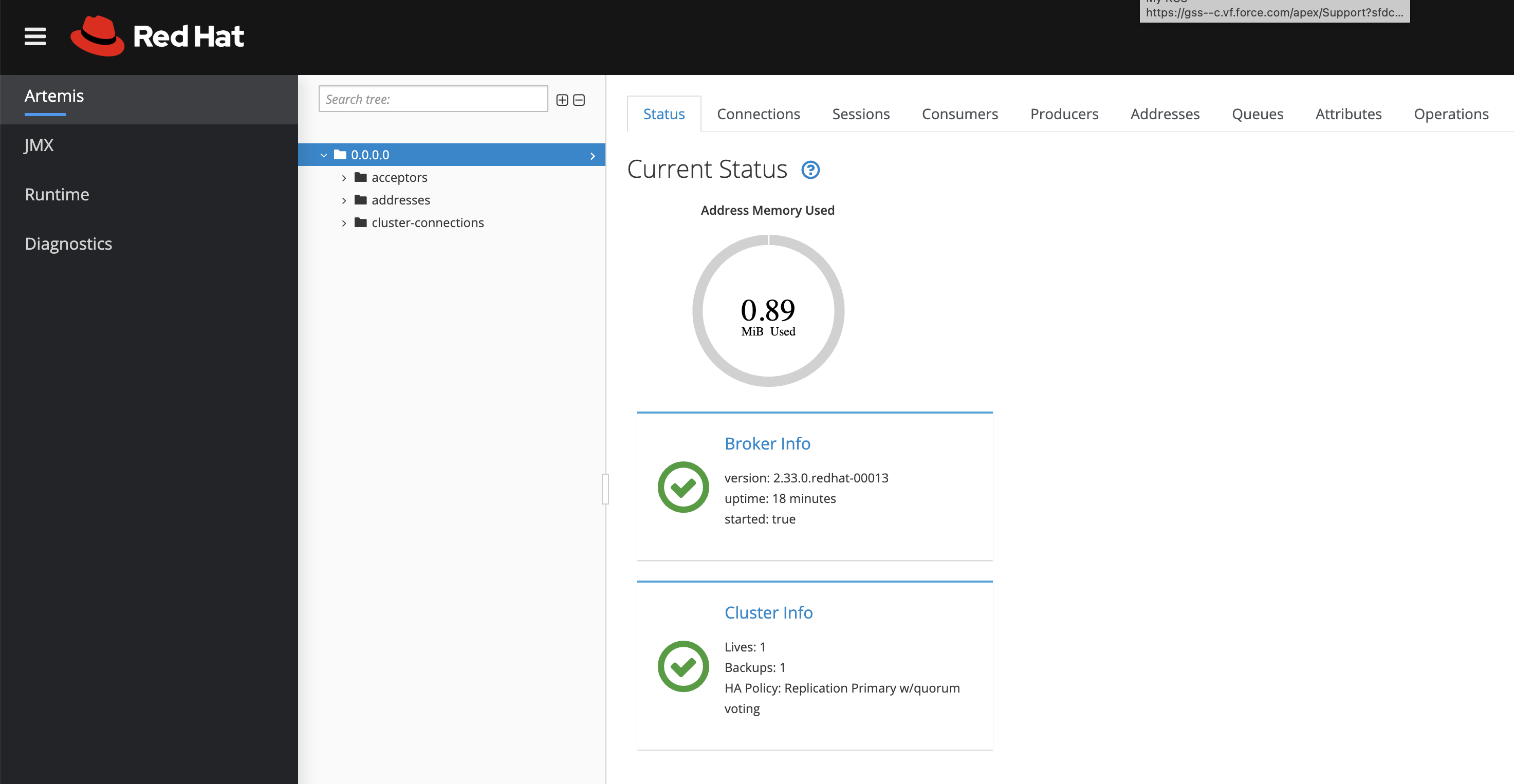 2. In the Console, observe that Cluster Info in Artemis / Status tab shows that cluster is ok