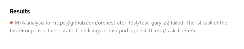 Actual results: See above. The outputted error in the results does not indicate the actual source of the failure. From looking at the MTA workflow pod logs: