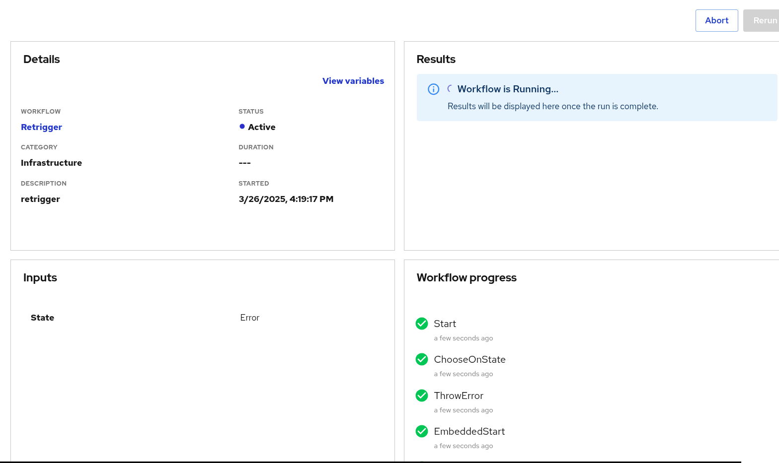 Workflow status stays in Error after retrigger. If the workflow completes it moves to Completed state, but the fact that it is running again is not clear to the user. The Results section has failure message until completion.