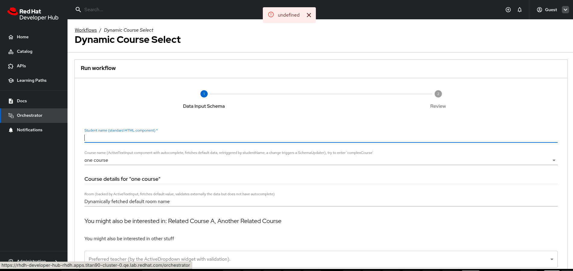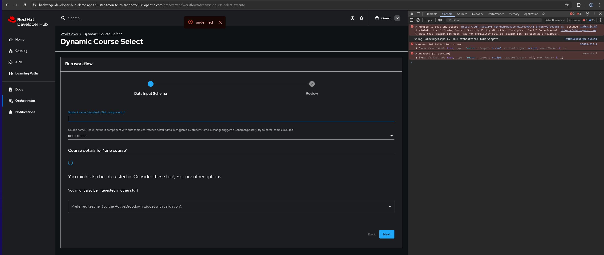 After deploying the Form Widget Demo workflow for the first time, there is an "undefined" error popup. It disappears after refreshing the page: