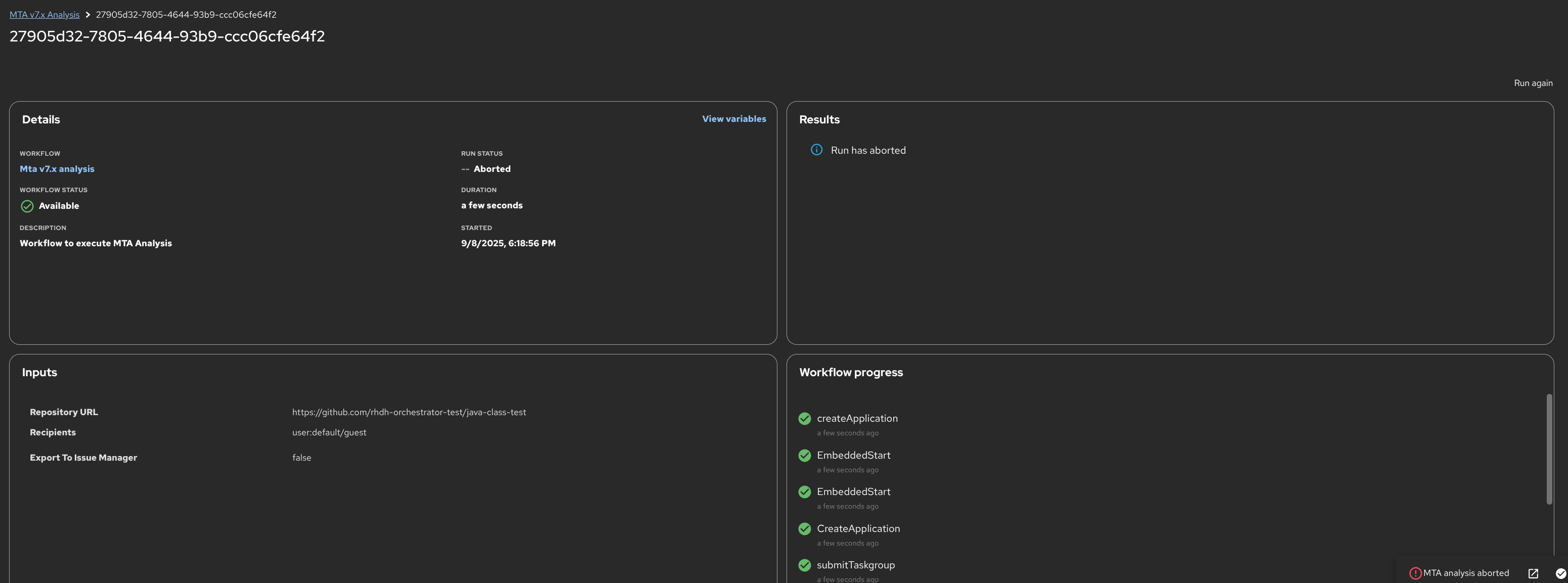 Description of the problem: When aborting a workflow in dark mode, the "Run again" button turns black (button is NOT disabled ) and then blue again after a few seconds. This may just be a caching issue, but it looks like an error.