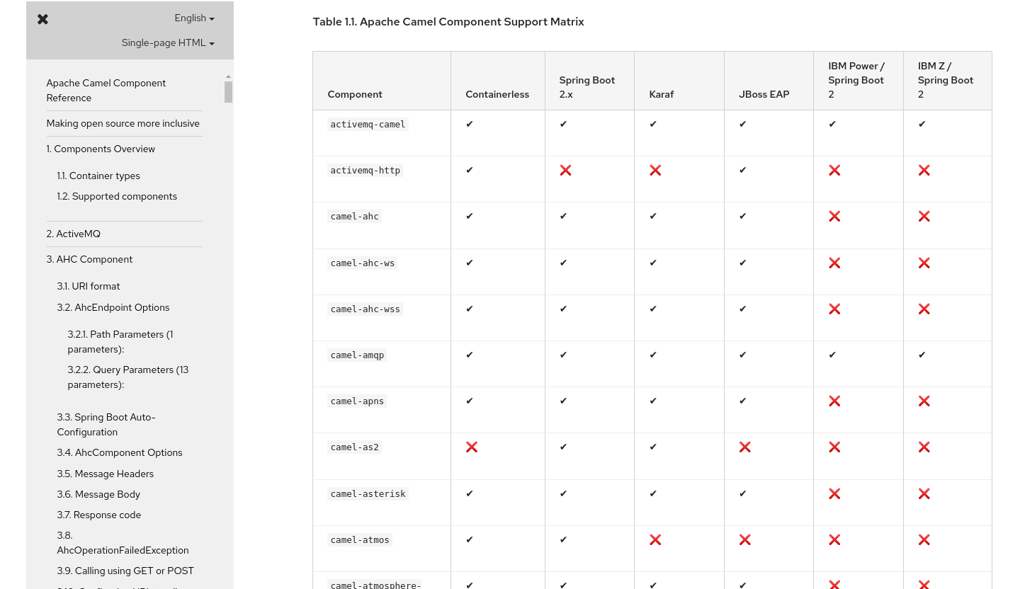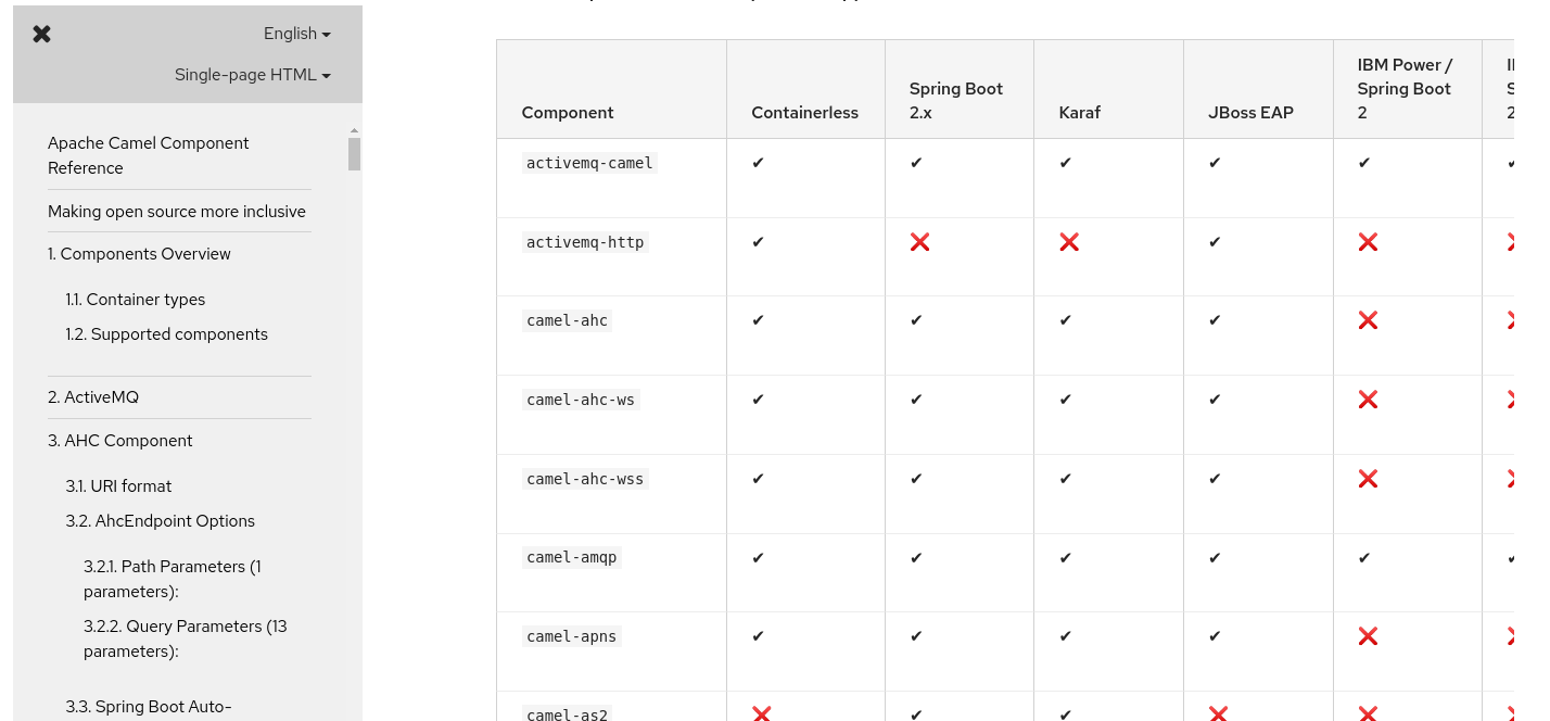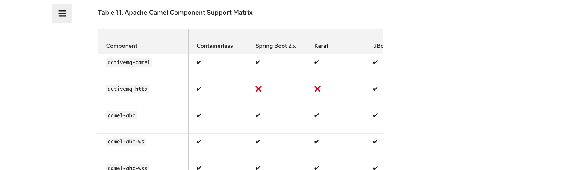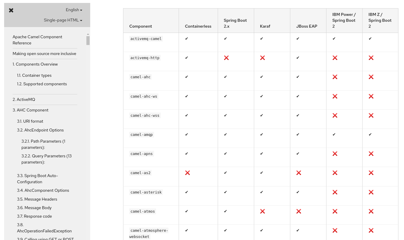 The formatting of the large table in the Camel component reference guide that lists all supported Camel component is improper.