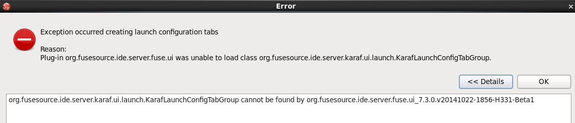 Plug-in org.fusesource.ide.server.fuse.ui was unable to load class org.fusesource.ide.server.karaf.ui.launch.KarafLaunchConfigTabGroup.