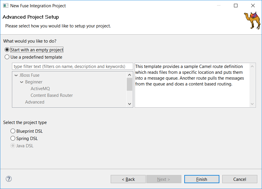 • use predefined templater-> select ActiveMQ, it will disable Java DSL