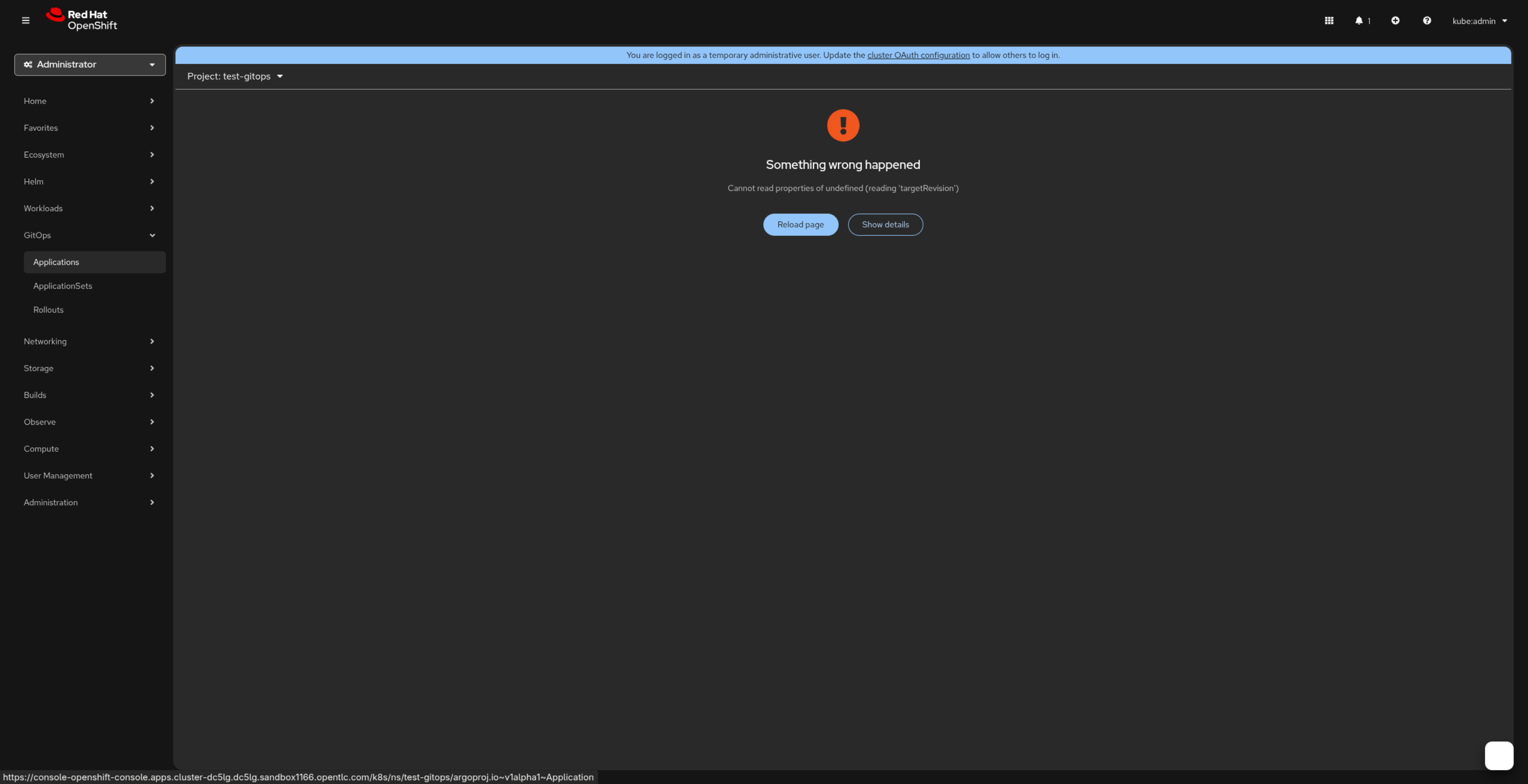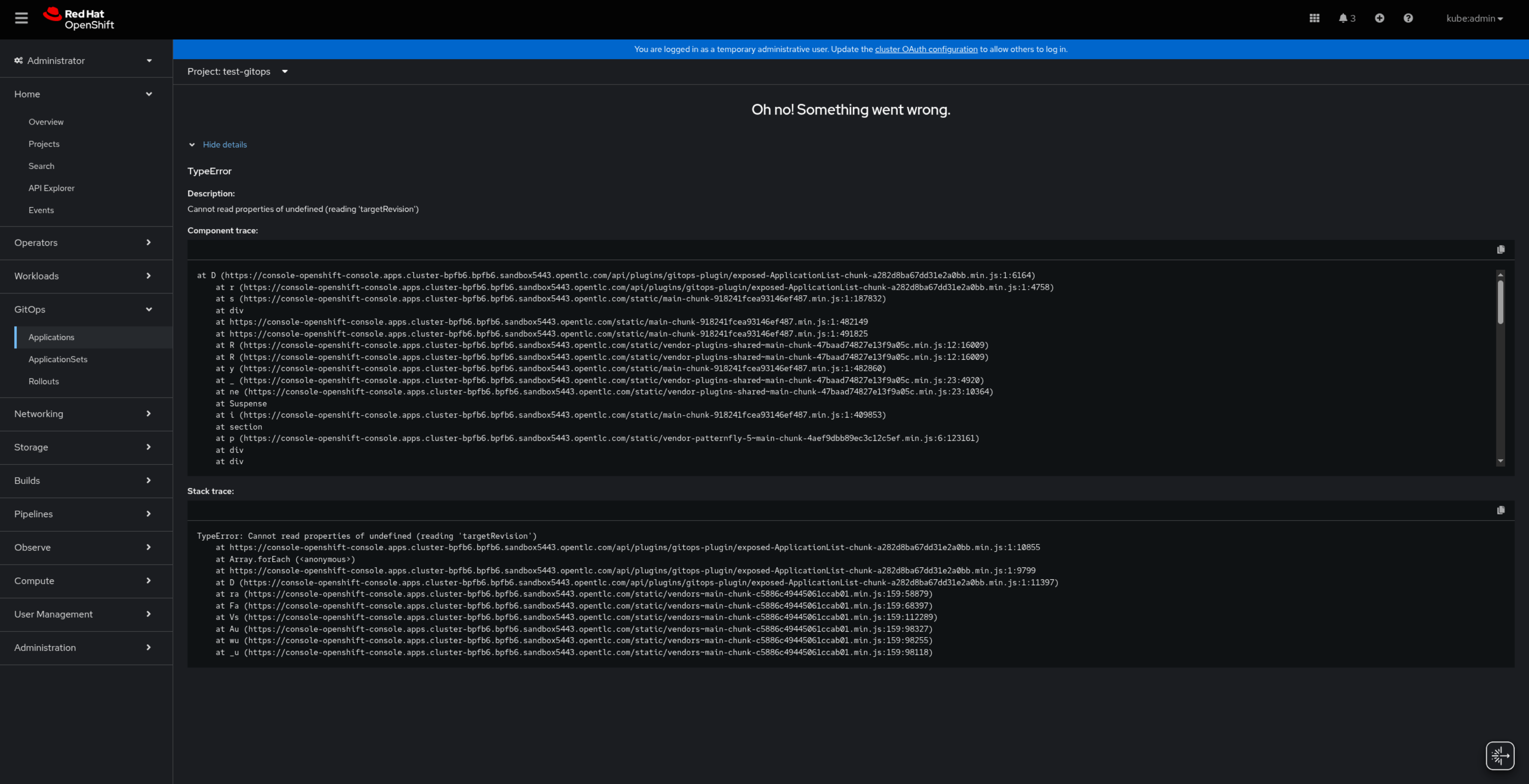 In OpenShift 4.20, the console displays “Something wrong happened” along with the JavaScript error Cannot read properties of undefined (reading 'targetRevision').