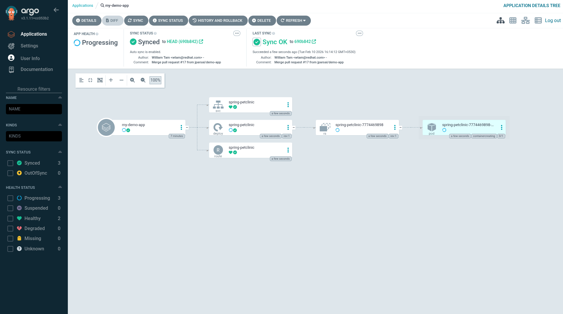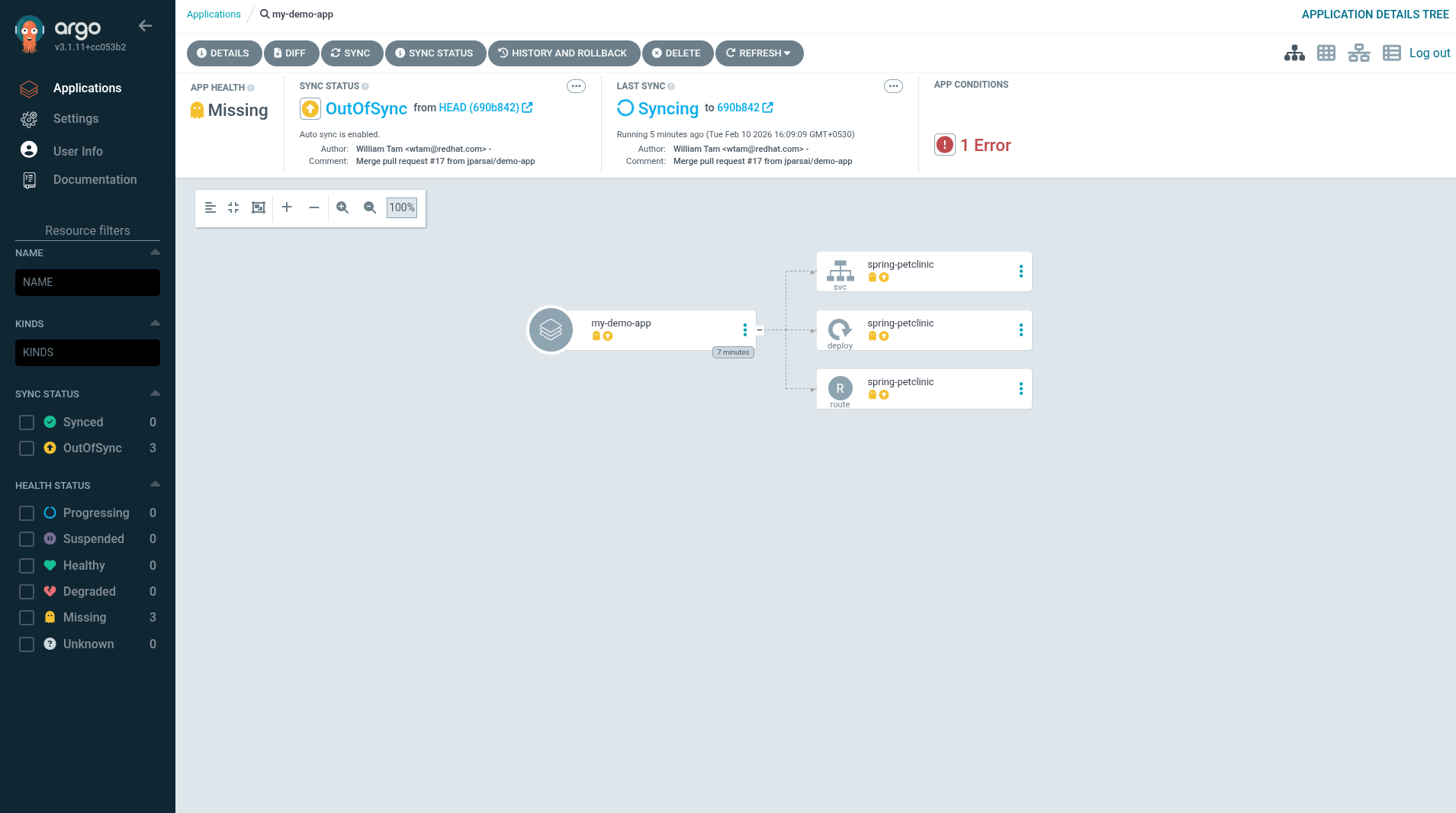 • Once the application appears in UI. the sync does not happen until 'Sync' is clicked in UI, see app-sync.txt for app yamls before and after sync