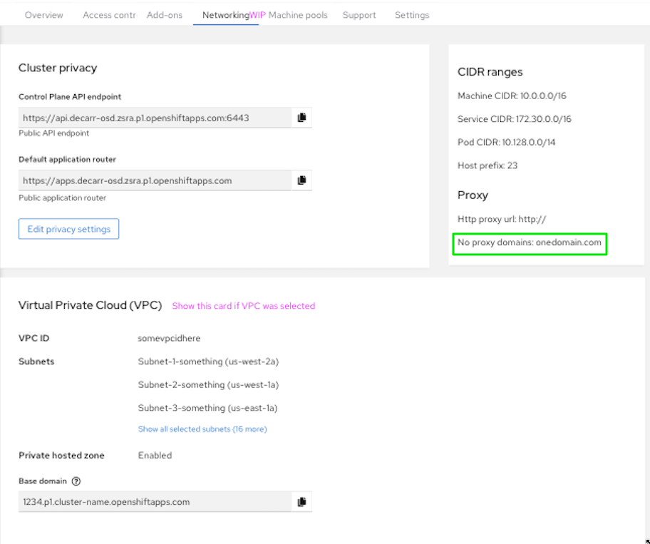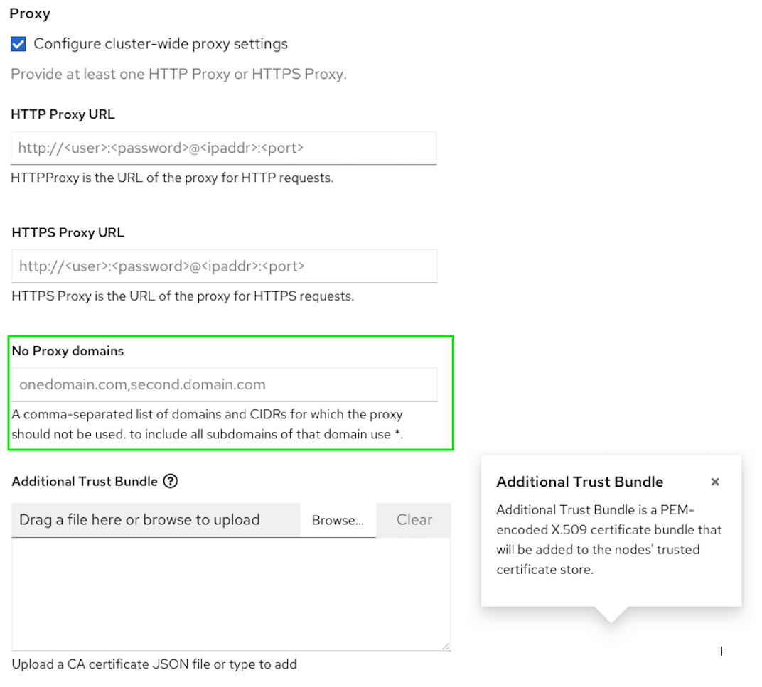 Provide READ/WRITE on an additional cluster-wide configuration field, "No Proxy domains". The existing proxy API was expanded to support the no_proxy field in SDA-5565. This field should be an optional field asked during cluster-wide proxy configuration. It should also be shown as a read-only field on the networking tab if provided.