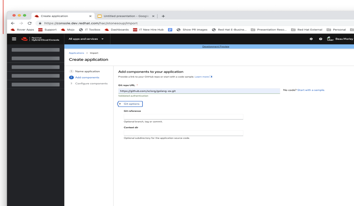 To add components to your application, provide a link to your GitHub repo or start with a code sample. Learn more [split-screen icon]