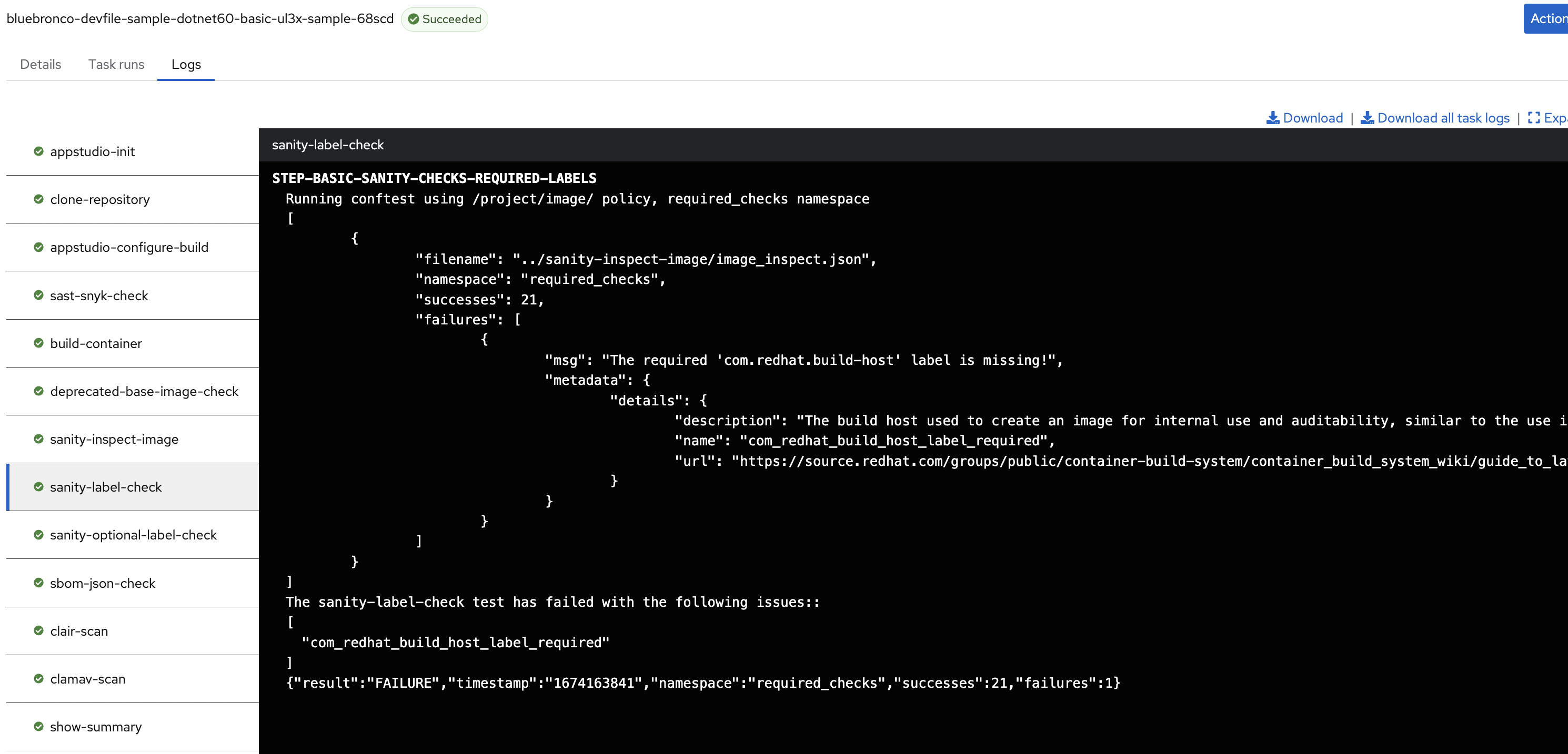 The task shows success but its log says it failed.