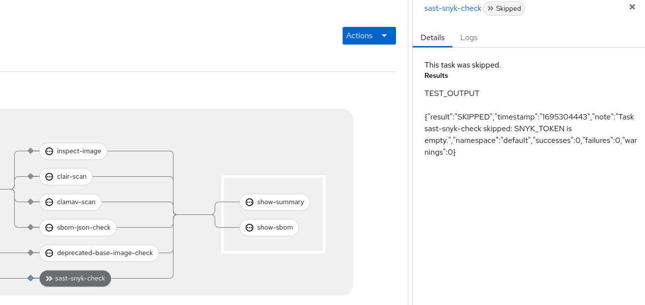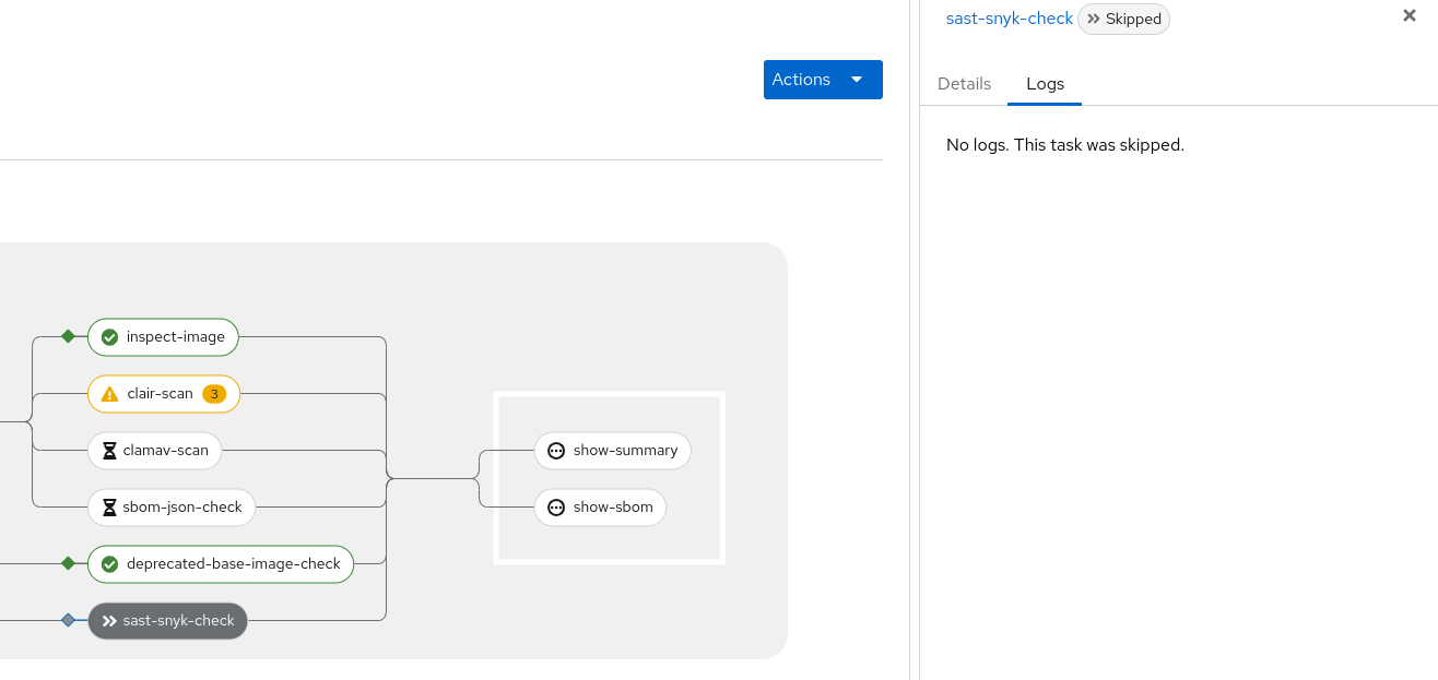 sast-snyk-check in RHTAP ran but returned SKIPPED status. However UI doesn't show logs, saying that there are no logs because task was skipped, but in fact there are logs because task was running and selfevaluated as skipped.