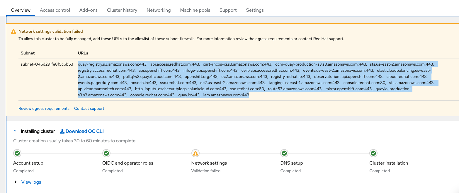 The warning with inflight check is shown - (bug -https://issues.redhat.com/browse/OCM-4162)