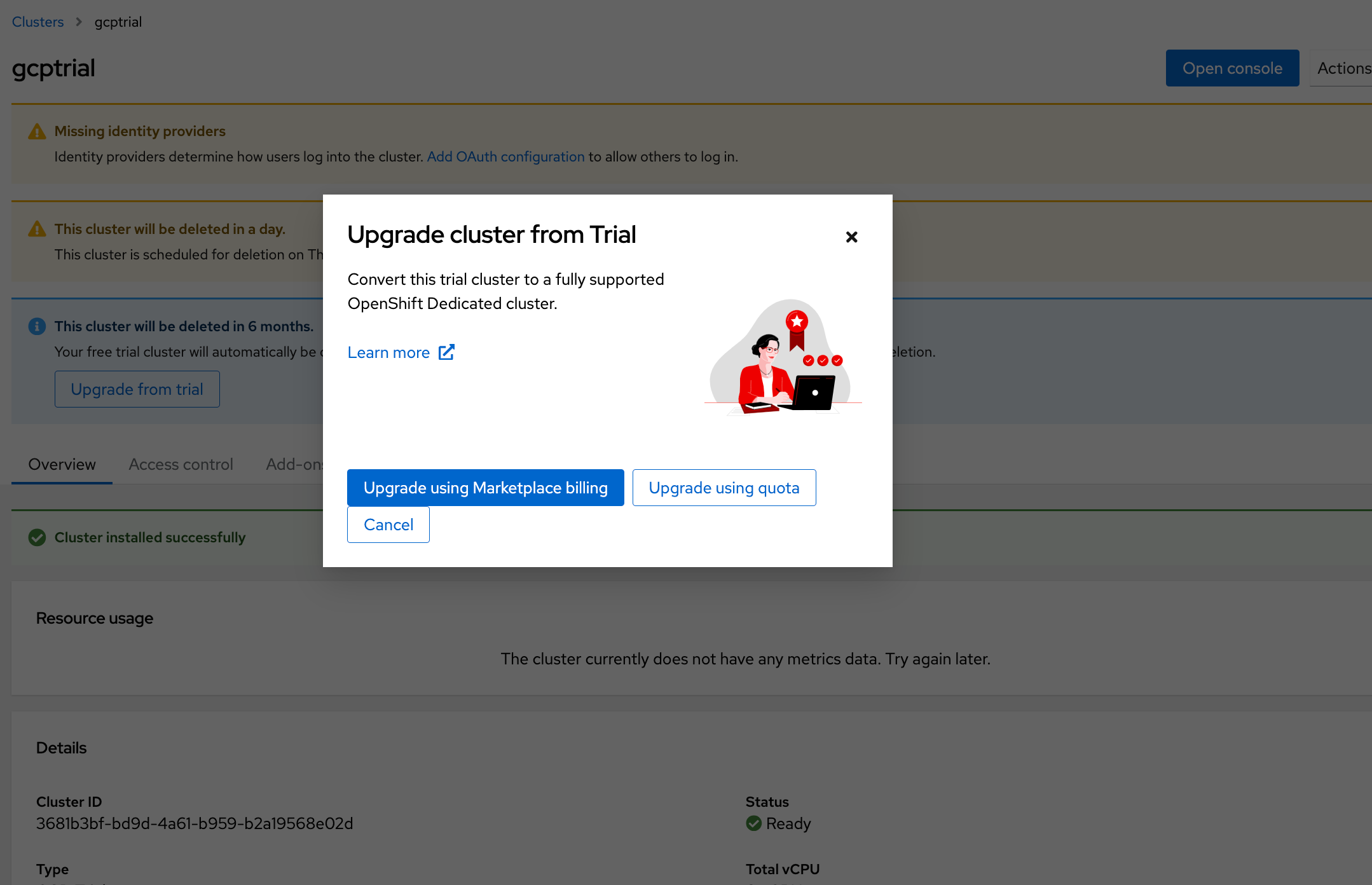 Observe the alignment of the buttons Upgrade using Marketplace billing, Upgrade using quota, and Cancel buttons.