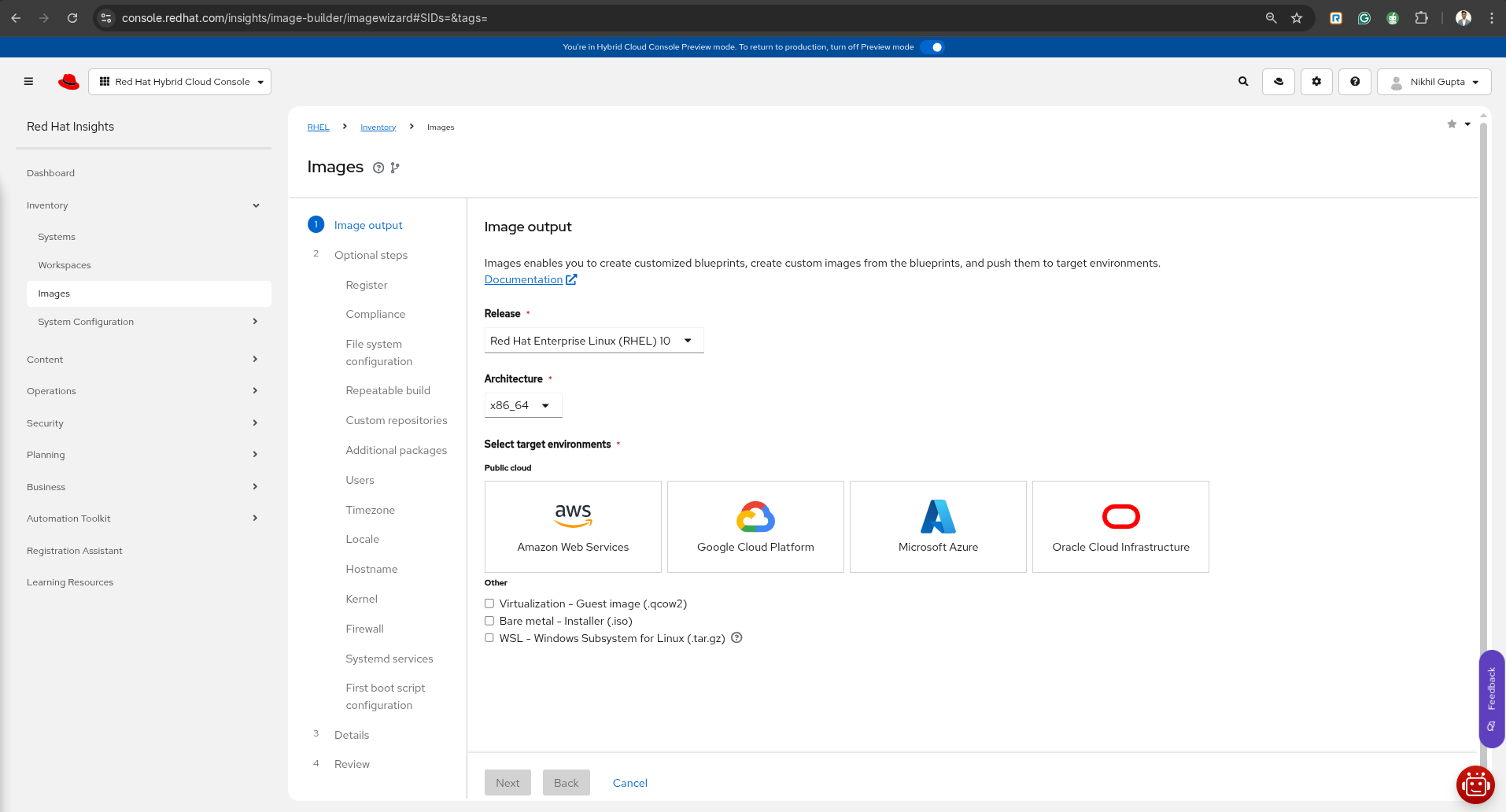 Cannot use image builder from the hybrid cloud console to create VMWare compatible images from RHEL 10, though RHEL 8 and 9 do have this option.
