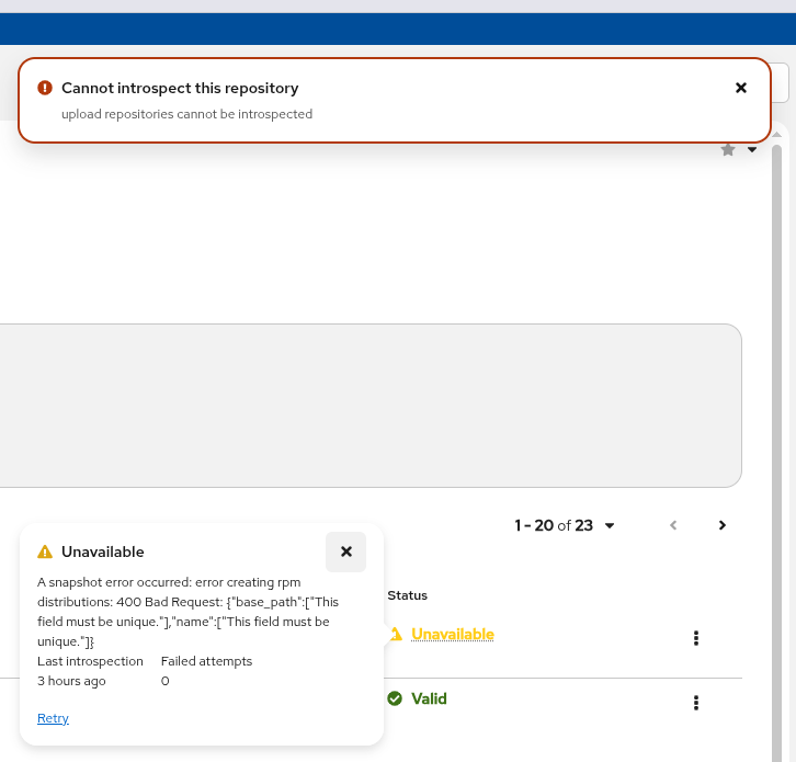 When an upload type repo fails to get to `Valid` status, the UI reports its state as `Unavailable`, with some error message and below that it lists the time of `Last introspection`, number of `Failed attempts` and present a `Retry` button, which when pressed starts an `Introspection` type task which fails for upload repos since they can't be introspected.