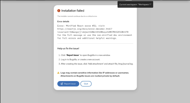 After changing the time zone on the Date & Time screen and starting the installation fails with a React runtime error.