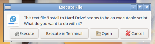A modal appears: “This text file ‘Install to Hard Drive’ seems to be an executable script. What do you want to do with it?” with buttons Execute / Execute in Terminal / Open / Cancel.