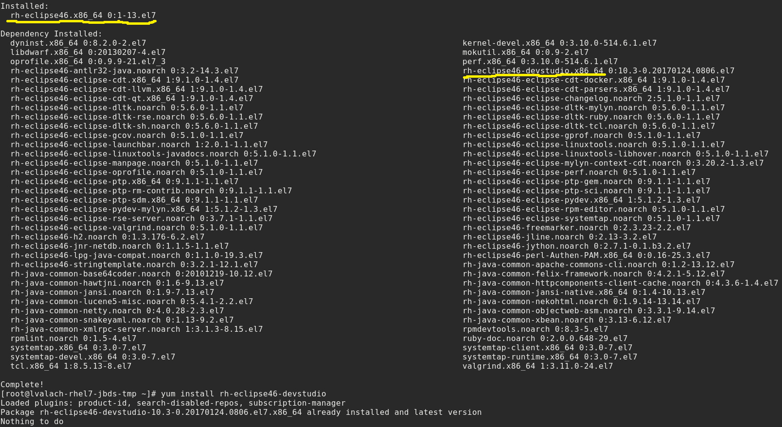 • Notice that rh-eclipse46-devstudio has been installed as dependency