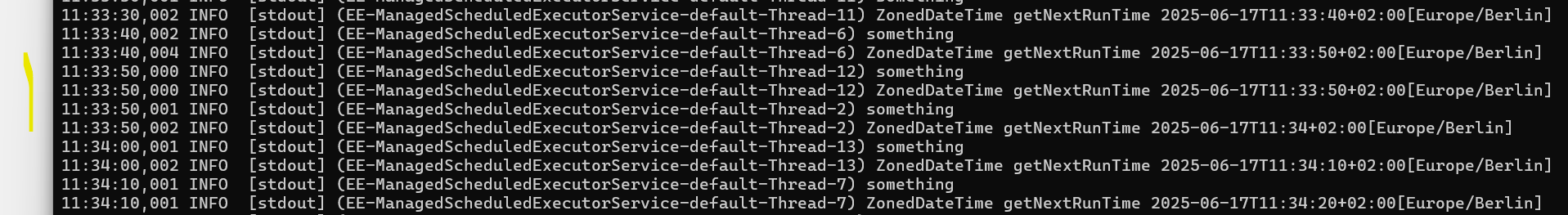 import jakarta.annotation.Resource; import jakarta.enterprise.concurrent.CronTrigger; import jakarta.enterprise.concurrent.LastExecution; import jakarta.enterprise.concurrent.ManagedScheduledExecutorService; import jakarta.enterprise.context.ApplicationScoped; import jakarta.enterprise.event.Observes; import jakarta.enterprise.event.Startup; import java.time.ZoneId; import java.time.ZonedDateTime; @ApplicationScoped public class DummyBean { @Resource(mappedName = "java:jboss/ee/concurrency/scheduler/default") ManagedScheduledExecutorService executorService; public DummyBean() { } private void onStart(@Observes Startup startup) { System.out.println("Start"); executorService.schedule(() -> something(), new CronTrigger(ZoneId.systemDefault()) { @Override public ZonedDateTime getNextRunTime(LastExecution lastExecutionInfo, ZonedDateTime taskScheduledTime) { ZonedDateTime nextRunTime = super.getNextRunTime(lastExecutionInfo, taskScheduledTime); System.out.println("ZonedDateTime getNextRunTime " + nextRunTime); return nextRunTime; } }.hours("*").minutes("*").seconds("*/10")); } private void something() { System.out.println("something"); } }