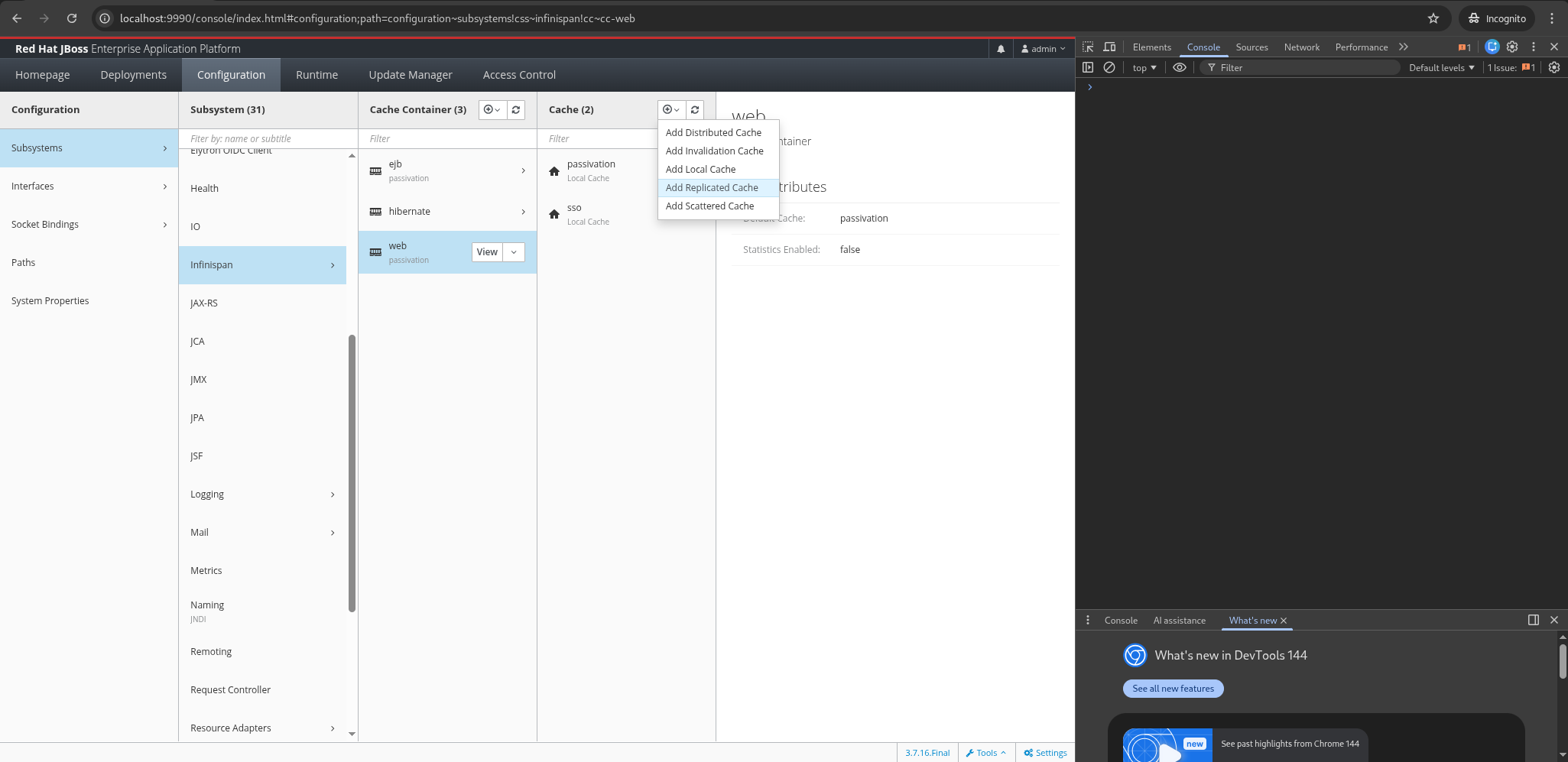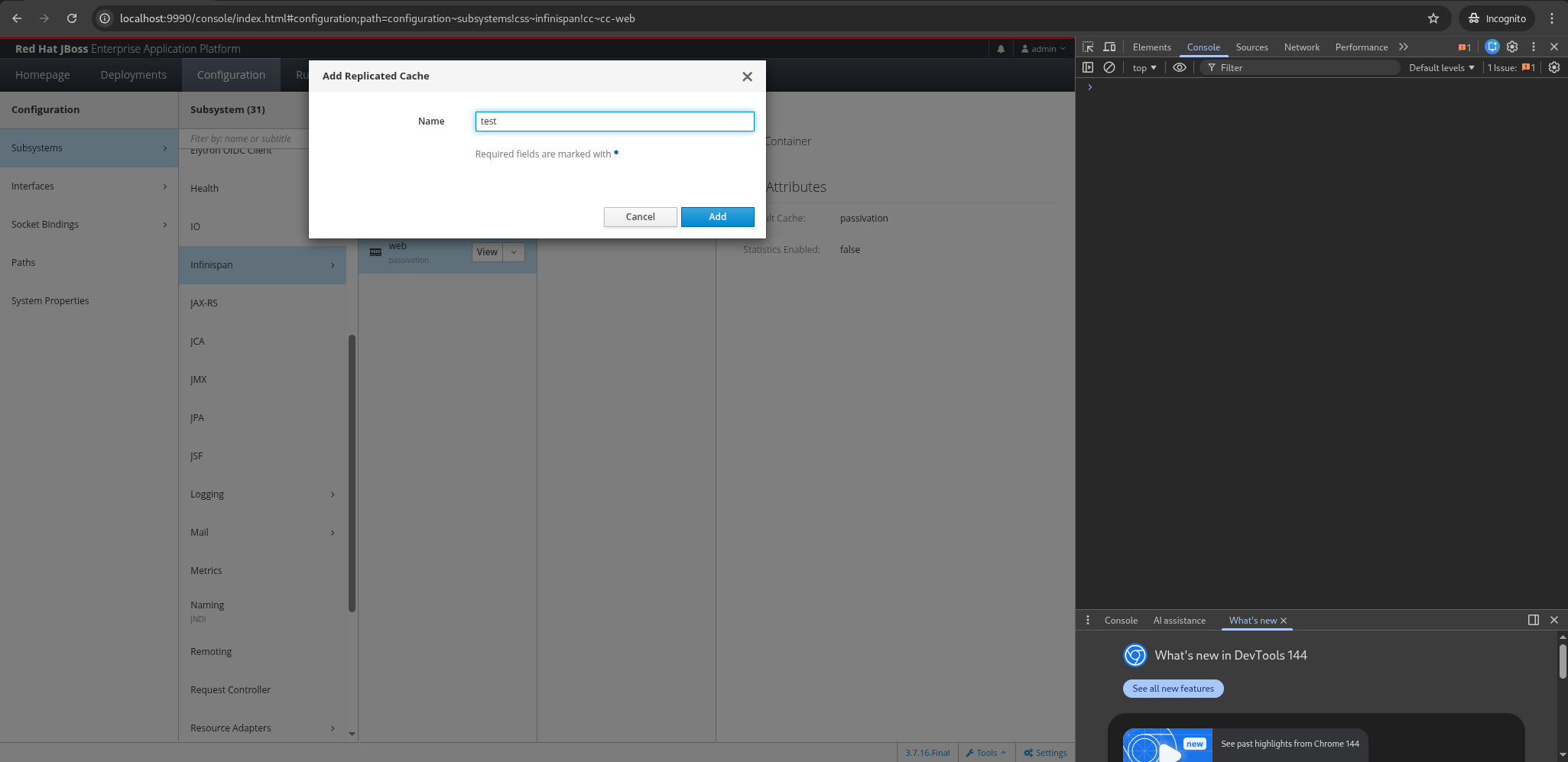 When adding a replicated-cache through the Web management console of JBoss EAP 8.1.3 started with a standalone.xml that does not include the jGroups subsystem, the error is only output to the browser console.