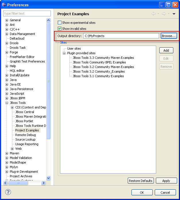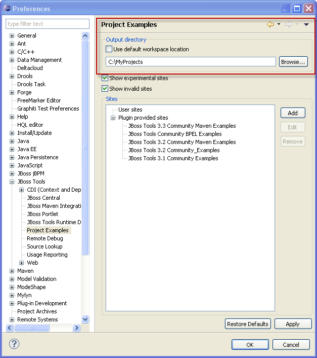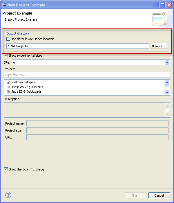 JBIDE-9877 project examples should go into user workspace and preferably be able to set it differentl