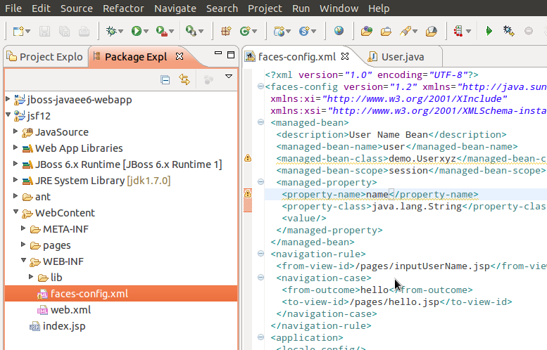 4. Warning marker appear in faces-config.xml file editor on the line with managed bean configuration