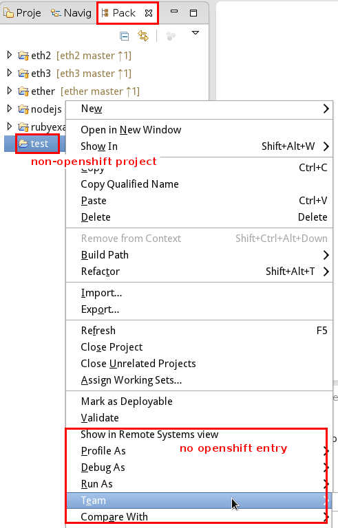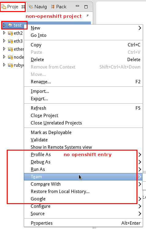 6. EXEC: in Package Explorer: select your new project and invoke the context menu and verify that there's no OpenShift entry in it