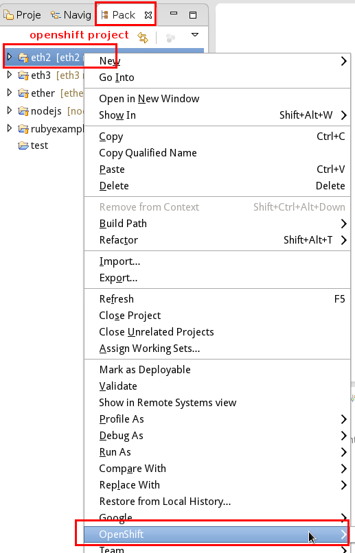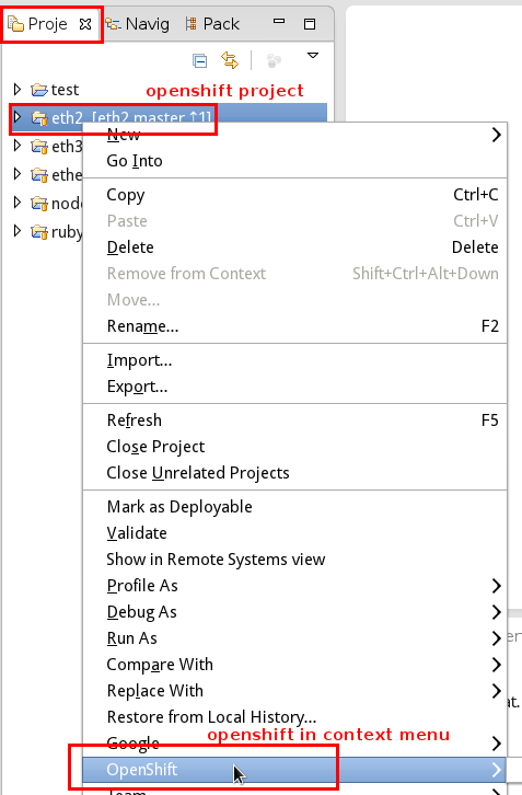 The OpenShift menu contribution is visible when right-clicking any Eclipse project (not only an OpenShift project).