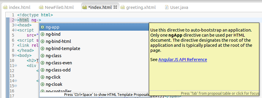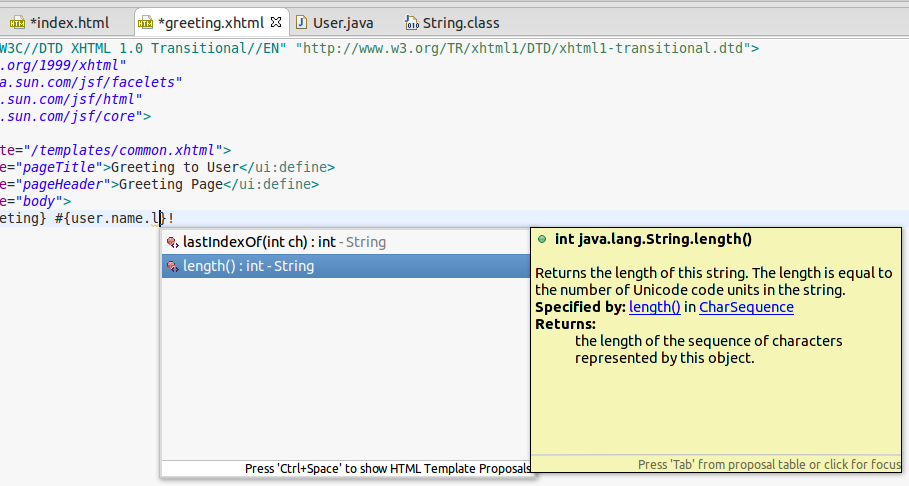 2. Internal links to JavaElement (used in JSF EL). It works in the same way as Eclipse JDT content assist does. Such links are supposed to be opened in SWT web browser (in the same description window):