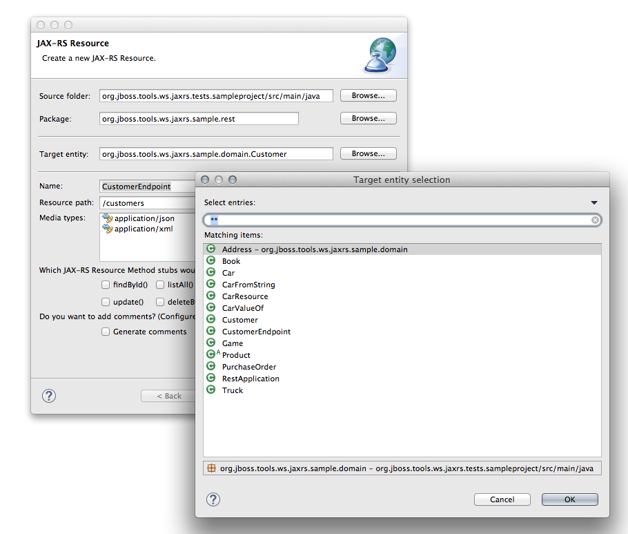 When a project contains JPA entities and you try to create a new JAX-RS Resource, browsing for "Target Entity" displays a blank viewer by default. I expected all entities from the project to be displayed, similar to how other wizards work.