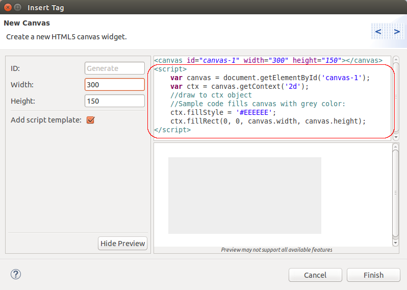 New Canvas wizard (JBIDE-18877), generates JavaScript code. Preview should add styles to keywords, comments, string constants, etc., as the source editor does it.