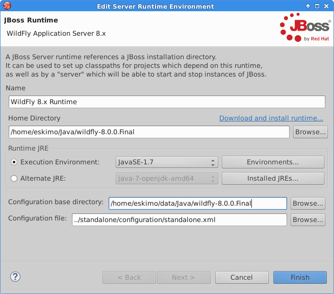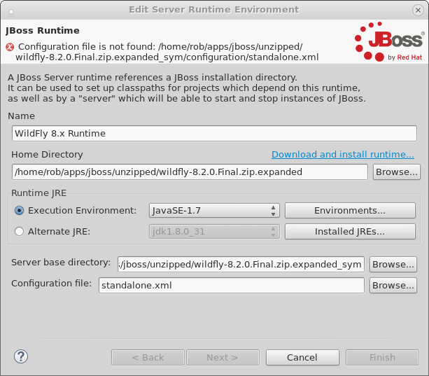 java.lang.IllegalStateException: basedir /home/eskimo/Java/wildfly-8.0.0.Final/configuration does not exist. at org.apache.tools.ant.DirectoryScanner.scan(DirectoryScanner.java:879) at org.jboss.ide.eclipse.as.core.extensions.descriptors.AntFileFilter.getIncludedFiles(AntFileFilter.java:40) at org.jboss.ide.eclipse.as.core.extensions.descriptors.XPathQuery.refresh(XPathQuery.java:133) at org.jboss.tools.as.core.server.controllable.subsystems.internal.XPathsPortsController.findPort(XPathsPortsController.java:80) at org.jboss.tools.as.core.server.controllable.subsystems.internal.XPathsPortsController.getPortOffset(XPathsPortsController.java:128) at org.jboss.tools.as.core.server.controllable.subsystems.internal.XPathsPortsController.getJBossWebPort(XPathsPortsController.java:110) at org.jboss.tools.as.core.server.controllable.subsystems.internal.XPathsPortsController.findPort(XPathsPortsController.java:58) at org.jboss.ide.eclipse.as.core.server.internal.JBossServer.findPort(JBossServer.java:209) at org.jboss.ide.eclipse.as.core.server.internal.JBossServer.getJBossWebPort(JBossServer.java:195) at org.jboss.ide.eclipse.as.core.extensions.polling.WebPortPoller.getURL(WebPortPoller.java:84) at org.jboss.ide.eclipse.as.core.extensions.polling.WebPortPoller.getCurrentStateSynchronous(WebPortPoller.java:155) at org.jboss.ide.eclipse.as.core.util.PollThreadUtils.isServerStarted(PollThreadUtils.java:227) at org.jboss.ide.eclipse.as.core.util.PollThreadUtils.isServerStarted(PollThreadUtils.java:213) at org.jboss.ide.eclipse.as.core.server.internal.launch.StandardLocalJBossStartLaunchDelegate.isServerStarted(StandardLocalJBossStartLaunchDelegate.java:68) at org.jboss.ide.eclipse.as.wtp.core.server.launch.AbstractStartJavaServerLaunchDelegate.preLaunchCheck(AbstractStartJavaServerLaunchDelegate.java:117) at org.jboss.tools.as.core.server.controllable.subsystems.internal.LocalJBossLaunchController.preLaunchCheck(LocalJBossLaunchController.java:119) at org.jboss.ide.eclipse.as.wtp.core.server.launch.ControllableServerLaunchConfiguration.preLaunchCheck(ControllableServerLaunchConfiguration.java:86) at org.eclipse.debug.internal.core.LaunchConfiguration.launch(LaunchConfiguration.java:840) at org.eclipse.debug.internal.core.LaunchConfiguration.launch(LaunchConfiguration.java:739) at org.eclipse.debug.internal.core.LaunchConfiguration.launch(LaunchConfiguration.java:731) at org.eclipse.wst.server.core.internal.Server.startImpl2(Server.java:3541) at org.eclipse.wst.server.core.internal.Server.startImpl(Server.java:3477) at org.eclipse.wst.server.core.internal.Server$StartJob.run(Server.java:367) at org.eclipse.core.internal.jobs.Worker.run(Worker.java:54)