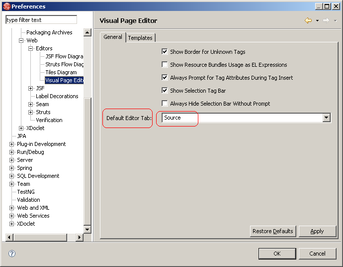EXECUTE: Window->Preferences-> JBoss Tools->Web >Editors> Visual Page Editor
