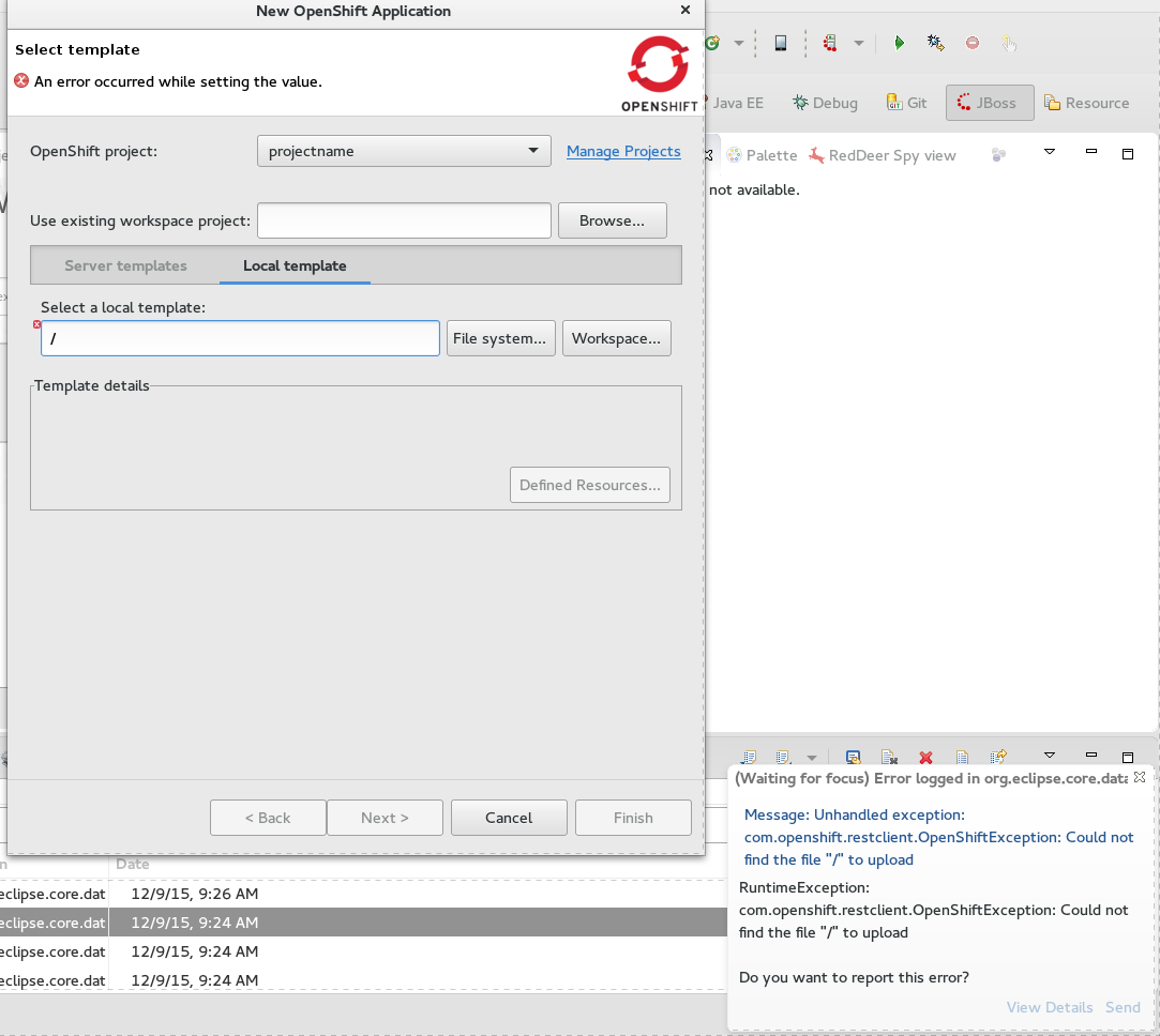 ASSERT: Have an OpenShift 3 connection with a project. EXEC: Open New OpenShift application wizard EXEC: Select local template tab EXEC: Start typing a path to text widget for local template path. RESULT: There are several errors in error log and sometimes dialog to report an error pops up. EXPECTED RESULT: There is only validation error shown on the wizard page.