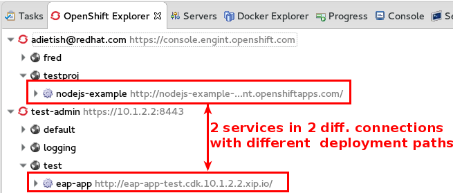 ASSERT: make sure that you have 2 different connections with different projects and 2 different services: 1x node and 1x eap (which differ in deployment path) EXEC: launch new OpenShift 3 server adapter wizard and pick 1st connection. EXEC: Pick the 1st service ASSERT: Pod deployment path is displayed correctly and differs from default /opt/app-root/src EXEC: get back to the connection page and pick your 2nd connection EXEC: Pick the 2nd service Result: Pod deployment path is displayed incorrectly, it is diplaying the default which is /opt/app-root/src