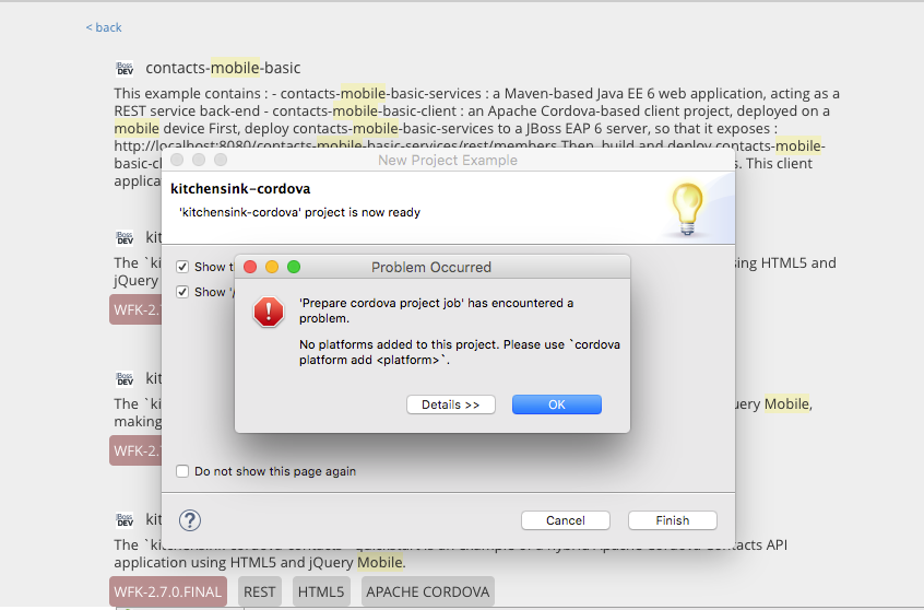 With upgrade to thym 2.0 the tooling is showing error about 'no platforms added' when importing mobile examples from central.