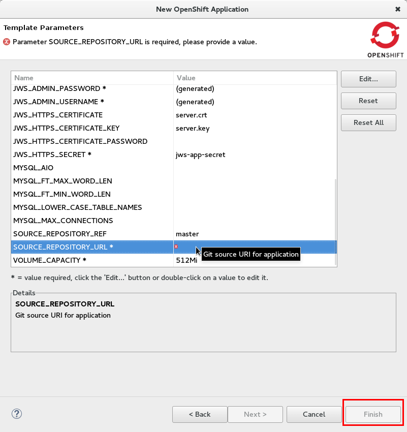 java.lang.NullPointerException at org.jboss.tools.openshift.internal.ui.wizard.newapp.NewApplicationWizard.performFinish(NewApplicationWizard.java:194) at org.eclipse.jface.wizard.WizardDialog.finishPressed(WizardDialog.java:790) at org.eclipse.jface.wizard.WizardDialog.buttonPressed(WizardDialog.java:423) at org.eclipse.jface.dialogs.Dialog$2.widgetSelected(Dialog.java:618) at org.eclipse.swt.widgets.TypedListener.handleEvent(TypedListener.java:248) at org.eclipse.swt.widgets.EventTable.sendEvent(EventTable.java:84) at org.eclipse.swt.widgets.Display.sendEvent(Display.java:4494) at org.eclipse.swt.widgets.Widget.sendEvent(Widget.java:1339) at org.eclipse.swt.widgets.Display.runDeferredEvents(Display.java:3832) at org.eclipse.swt.widgets.Display.readAndDispatch(Display.java:3443) at org.eclipse.jface.window.Window.runEventLoop(Window.java:818) at org.eclipse.jface.window.Window.open(Window.java:794) at org.jboss.tools.common.ui.WizardUtils.openWizardDialog(WizardUtils.java:287) at org.jboss.tools.common.ui.WizardUtils.openWizardDialog(WizardUtils.java:270) at org.jboss.tools.openshift.internal.ui.handler.NewApplicationHandler.execute(NewApplicationHandler.java:34) at org.eclipse.ui.internal.handlers.HandlerProxy.execute(HandlerProxy.java:295) at org.eclipse.ui.internal.handlers.E4HandlerProxy.execute(E4HandlerProxy.java:90) at sun.reflect.NativeMethodAccessorImpl.invoke0(Native Method) at sun.reflect.NativeMethodAccessorImpl.invoke(NativeMethodAccessorImpl.java:62) at sun.reflect.DelegatingMethodAccessorImpl.invoke(DelegatingMethodAccessorImpl.java:43) at java.lang.reflect.Method.invoke(Method.java:497) at org.eclipse.e4.core.internal.di.MethodRequestor.execute(MethodRequestor.java:54) at org.eclipse.e4.core.internal.di.InjectorImpl.invokeUsingClass(InjectorImpl.java:282) at org.eclipse.e4.core.internal.di.InjectorImpl.invoke(InjectorImpl.java:264) at org.eclipse.e4.core.contexts.ContextInjectionFactory.invoke(ContextInjectionFactory.java:132) at org.eclipse.e4.core.commands.internal.HandlerServiceHandler.execute(HandlerServiceHandler.java:152) at org.eclipse.core.commands.Command.executeWithChecks(Command.java:494) at org.eclipse.core.commands.ParameterizedCommand.executeWithChecks(ParameterizedCommand.java:491) at org.eclipse.e4.core.commands.internal.HandlerServiceImpl.executeHandler(HandlerServiceImpl.java:210) at org.eclipse.e4.ui.workbench.renderers.swt.HandledContributionItem.executeItem(HandledContributionItem.java:425) at org.eclipse.e4.ui.workbench.renderers.swt.AbstractContributionItem.handleWidgetSelection(AbstractContributionItem.java:449) at org.eclipse.e4.ui.workbench.renderers.swt.AbstractContributionItem$3.handleEvent(AbstractContributionItem.java:477) at org.eclipse.swt.widgets.EventTable.sendEvent(EventTable.java:84) at org.eclipse.swt.widgets.Display.sendEvent(Display.java:4494) at org.eclipse.swt.widgets.Widget.sendEvent(Widget.java:1339) at org.eclipse.swt.widgets.Display.runDeferredEvents(Display.java:3832) at org.eclipse.swt.widgets.Display.readAndDispatch(Display.java:3443) at org.eclipse.e4.ui.internal.workbench.swt.PartRenderingEngine$4.run(PartRenderingEngine.java:1118) at org.eclipse.core.databinding.observable.Realm.runWithDefault(Realm.java:336) at org.eclipse.e4.ui.internal.workbench.swt.PartRenderingEngine.run(PartRenderingEngine.java:1019) at org.eclipse.e4.ui.internal.workbench.E4Workbench.createAndRunUI(E4Workbench.java:157) at org.eclipse.ui.internal.Workbench$5.run(Workbench.java:691) at org.eclipse.core.databinding.observable.Realm.runWithDefault(Realm.java:336) at org.eclipse.ui.internal.Workbench.createAndRunWorkbench(Workbench.java:604) at org.eclipse.ui.PlatformUI.createAndRunWorkbench(PlatformUI.java:150) at org.eclipse.ui.internal.ide.application.IDEApplication.start(IDEApplication.java:138) at org.eclipse.equinox.internal.app.EclipseAppHandle.run(EclipseAppHandle.java:196) at org.eclipse.core.runtime.internal.adaptor.EclipseAppLauncher.runApplication(EclipseAppLauncher.java:134) at org.eclipse.core.runtime.internal.adaptor.EclipseAppLauncher.start(EclipseAppLauncher.java:104) at org.eclipse.core.runtime.adaptor.EclipseStarter.run(EclipseStarter.java:388) at org.eclipse.core.runtime.adaptor.EclipseStarter.run(EclipseStarter.java:243) at sun.reflect.NativeMethodAccessorImpl.invoke0(Native Method) at sun.reflect.NativeMethodAccessorImpl.invoke(NativeMethodAccessorImpl.java:62) at sun.reflect.DelegatingMethodAccessorImpl.invoke(DelegatingMethodAccessorImpl.java:43) at java.lang.reflect.Method.invoke(Method.java:497) at org.eclipse.equinox.launcher.Main.invokeFramework(Main.java:670) at org.eclipse.equinox.launcher.Main.basicRun(Main.java:609) at org.eclipse.equinox.launcher.Main.run(Main.java:1516) at org.eclipse.equinox.launcher.Main.main(Main.java:1489)