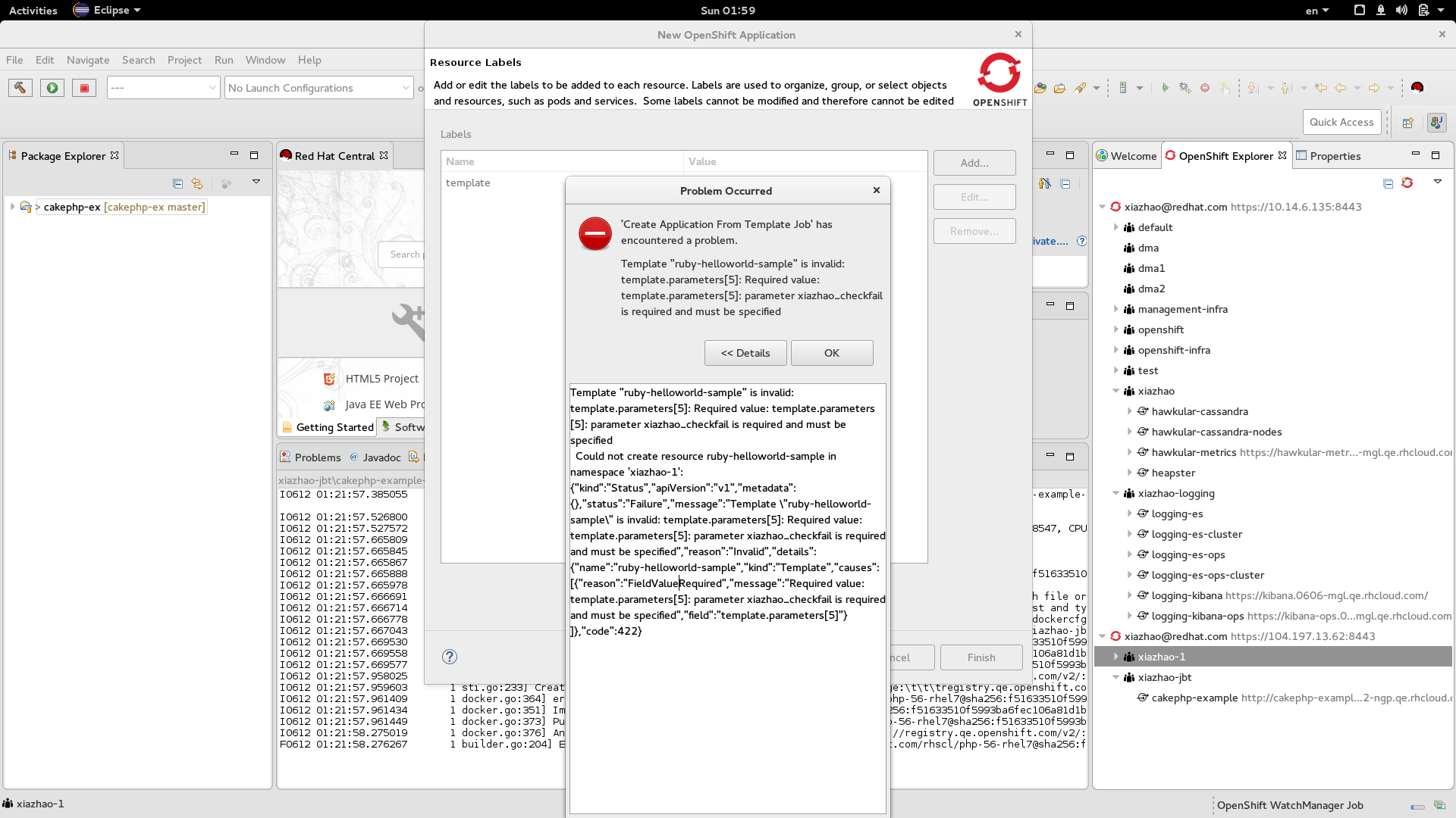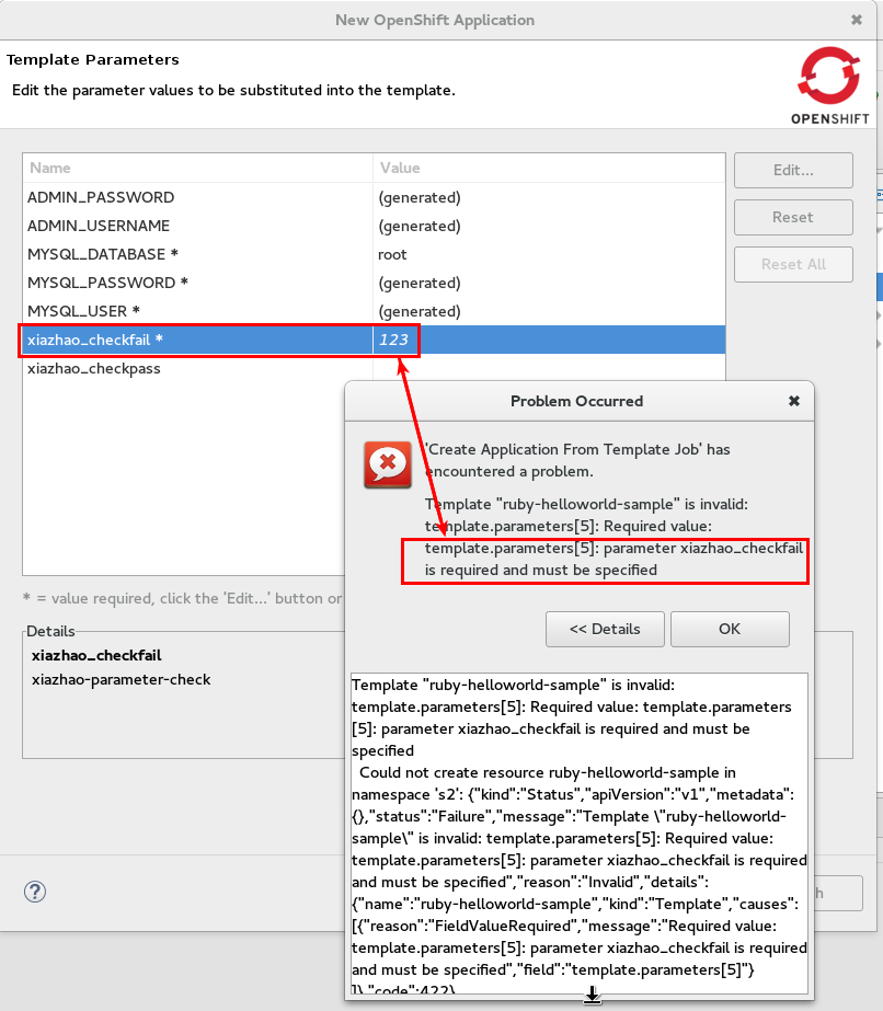1.Connect openshift with JBT 2.Create app from the local template in attachment 3.Give required value "123" to parameter "xiazhao_checkfail" inside new-app wizard 4.Click on the "Next>" button Actual results: Get error message: Template "ruby-helloworld-sample" is invalid: template.parameters [5] : Required value: template.parameters [5] : parameter xiazhao_checkfail is required and must be specified Could not create resource ruby-helloworld-sample in namespace 'xiazhao-1': {"kind":"Status","apiVersion":"v1","metadata":{},"status":"Failure","message":"Template \"ruby-helloworld-sample\" is invalid: template.parameters [5] : Required value: template.parameters [5] : parameter xiazhao_checkfail is required and must be specified","reason":"Invalid","details":{"name":"ruby-helloworld-sample","kind":"Template","causes":[ {"reason":"FieldValueRequired","message":"Required value: template.parameters[5]: parameter xiazhao_checkfail is required and must be specified","field":"template.parameters[5]"} ]},"code":422} Expected results: Should create app successfully with required parameter values set in JBT Additional info: Issue did not repro on web console