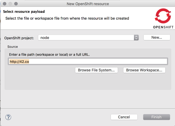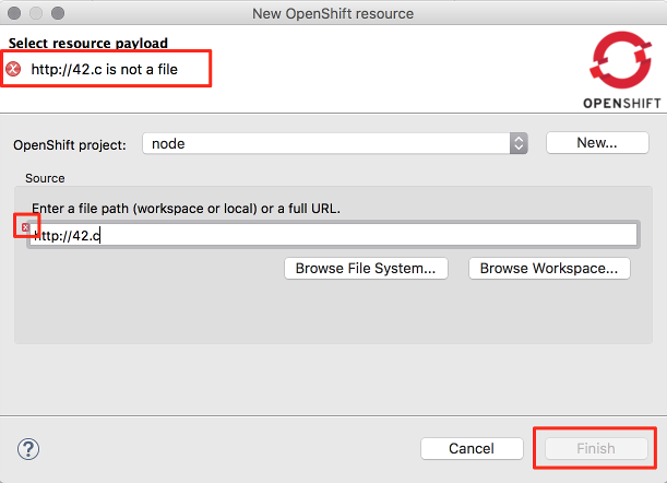 3. EXEC: Enter URL to non-existing template/json (ex. https://raw.githubusercontent.com/jbosstools/jbosstools-openshift/master/itests/org.jboss.tools.openshift.ui.bot.test/resources/hello.json)