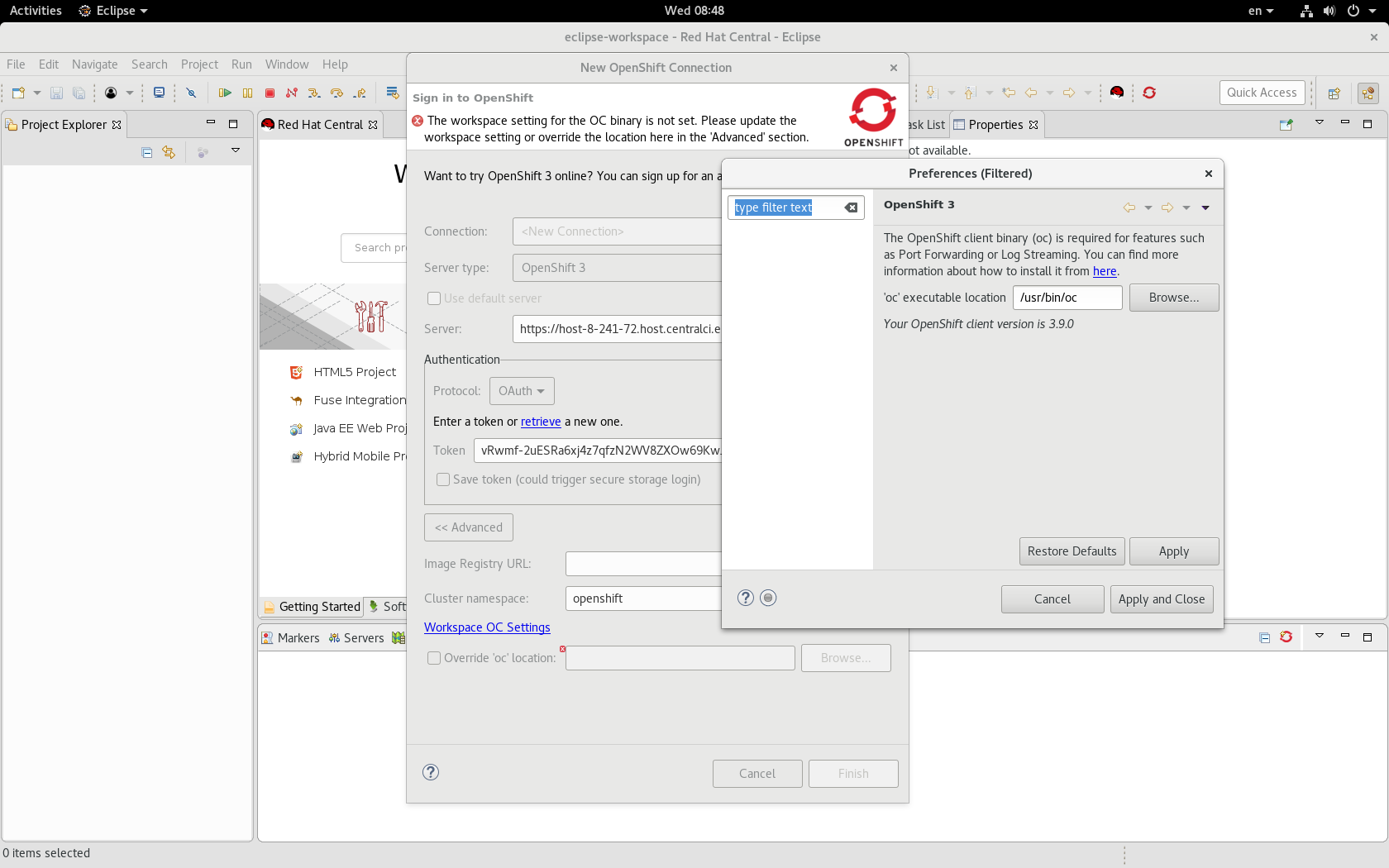 After installed JBoss Tools 4.5.2.Final on eclipse and connected to OpenShift, there is one error: "The workspace setting for the OC binary is not set. Please update the workspace setting or override the location here in the 'Advanced' section.". See the attached picture