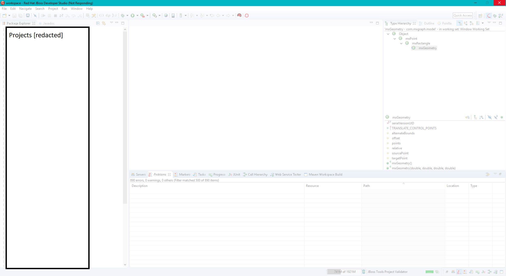The workspace is one EAR project, a couple dozen EJBs, 2 WARs, a couple dozen JAR webfragments (deployed inside the WARs), some misc projects - 67 projects alltogether.